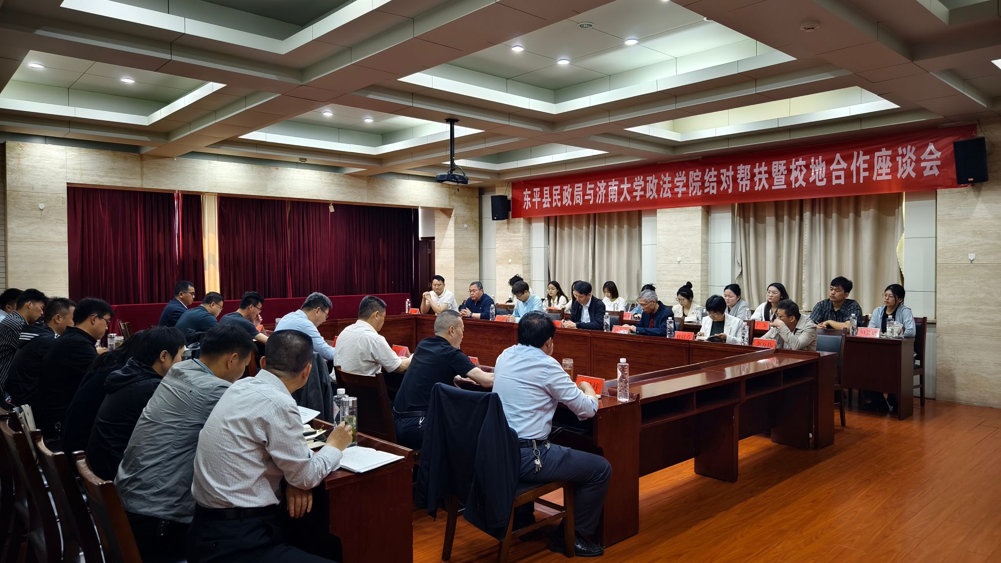 姚来涛局长主持合作座谈会,介绍了东平县经济社会发展及民政工作情况,提出为积极应对新时代民政事业发展新需求,要充分发挥高等院校和行业部门的叠加优势,汇聚教育科技人才创新驱动合力,拓宽民政人才培养路径。李涛介绍了学校、学院发展情况,并表示期望发挥学院学科与人才优势,深入开展校地合作,促推县域民政工作高质量发展。双方围绕创新研究课题展开深入交流。