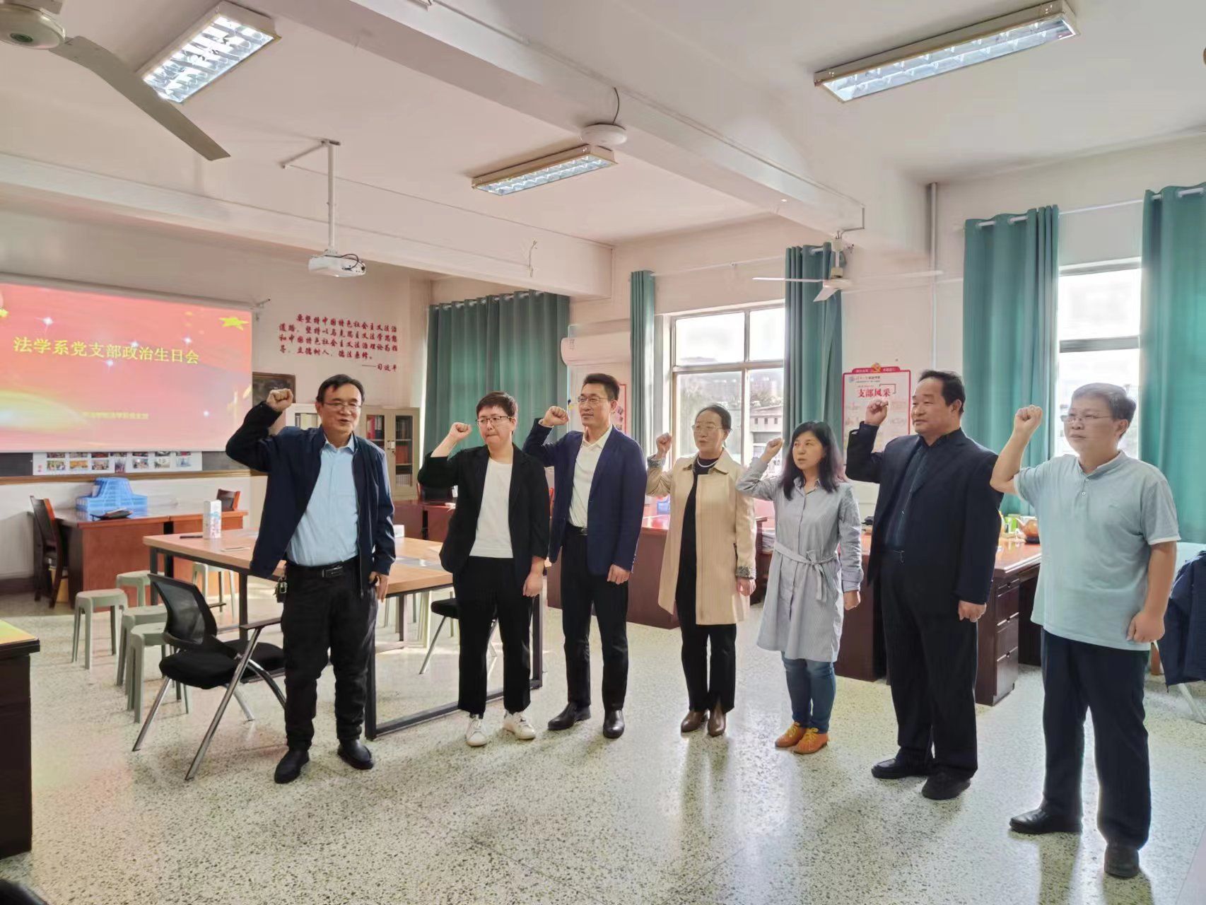 在4教法学系党员活动室,三位党员同志发表了“政治生日”感言,带领全体党员重温了入党誓词,“我志愿加入中国共产党,拥护党的纲领,遵守党的章程……”声音整齐洪亮,激发了党员们的光荣感和自豪感,引导党员不忘入党初心,始终昂扬向上、奋进向前。
