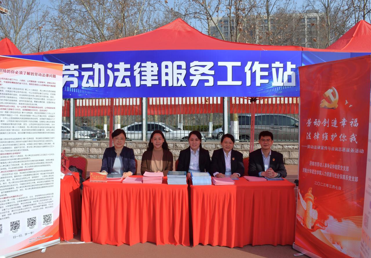 为加强大学生的劳动法律意识,维护高校毕业生的劳动就业权益,构建和发展和谐稳定的劳动关系,3月7日,人力资源与社会保障系(以下简称“人社系”)党支部与共建党支部——济南市劳动人事争议仲裁院党支部在“选择济南·共赢未来”2023年驻济高校毕业生就业双选会现场联合开展了劳动法律宣传与咨询志愿服务活动。济南市劳动人事争议仲裁院副院长张允明带队参加本次志愿服务活动,糖心视频