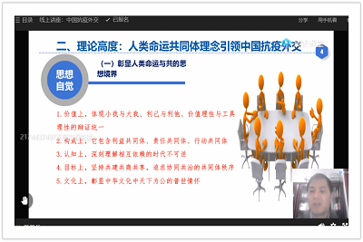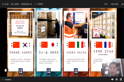 国际政治系副教授刘雨辰老师主讲,讲座题目为《高度、温度与力度:人类命运共同体理念下的中国抗疫外交》。讲座由学院副院长李慧明主持,通过腾讯课堂平台,学院师生300余人在线参与和互动。