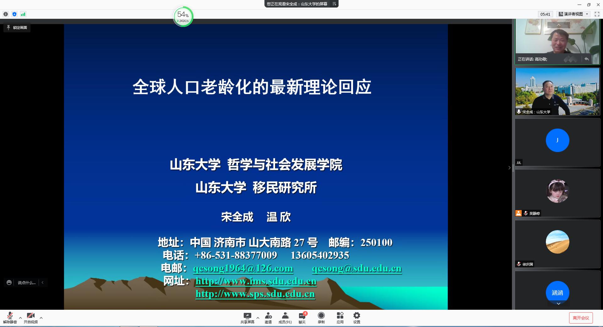 青龙山学术论坛暨社会学学科设立十五周年系列学术讲座于12月18日晚7点在腾讯会议平台线上举办,此次论坛邀请山东大学移民研究所所长、山东大学哲学与社会发展学院宋全成教授作题为《全球人口老龄化的最新理论回应》的学术报告,报告由高功敬教授主持,学院相关教师及社会学研究生共100余人线上参加。