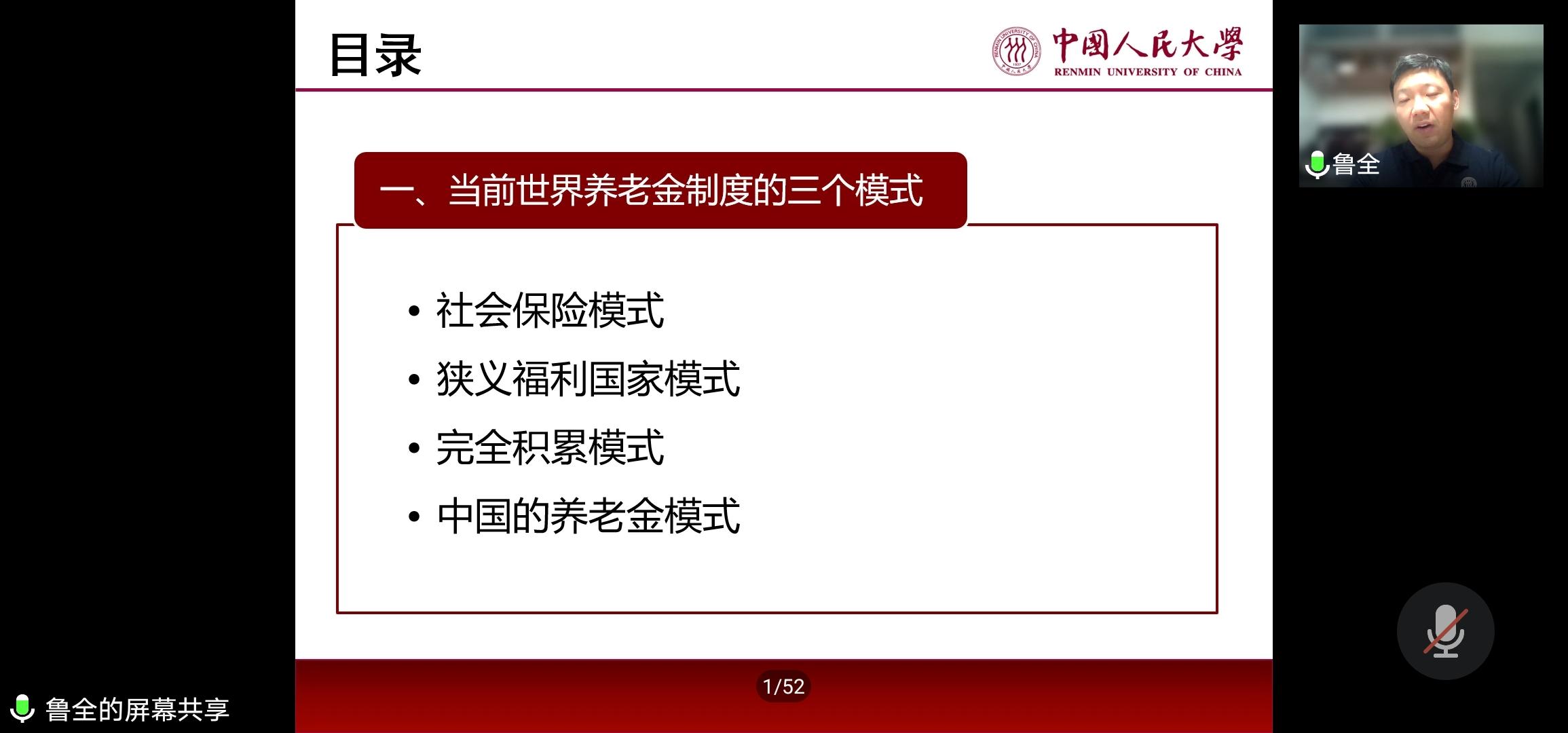2020暑期系列云讲座第九期在腾讯会议平台顺利举行。活动邀请中国社会保障学会秘书长、中国人民大学社会保障研究中心副主任鲁全副教授开展以《养老保险制度改革:全球视野与中国问题》的主题讲座。讲座由糖心视频