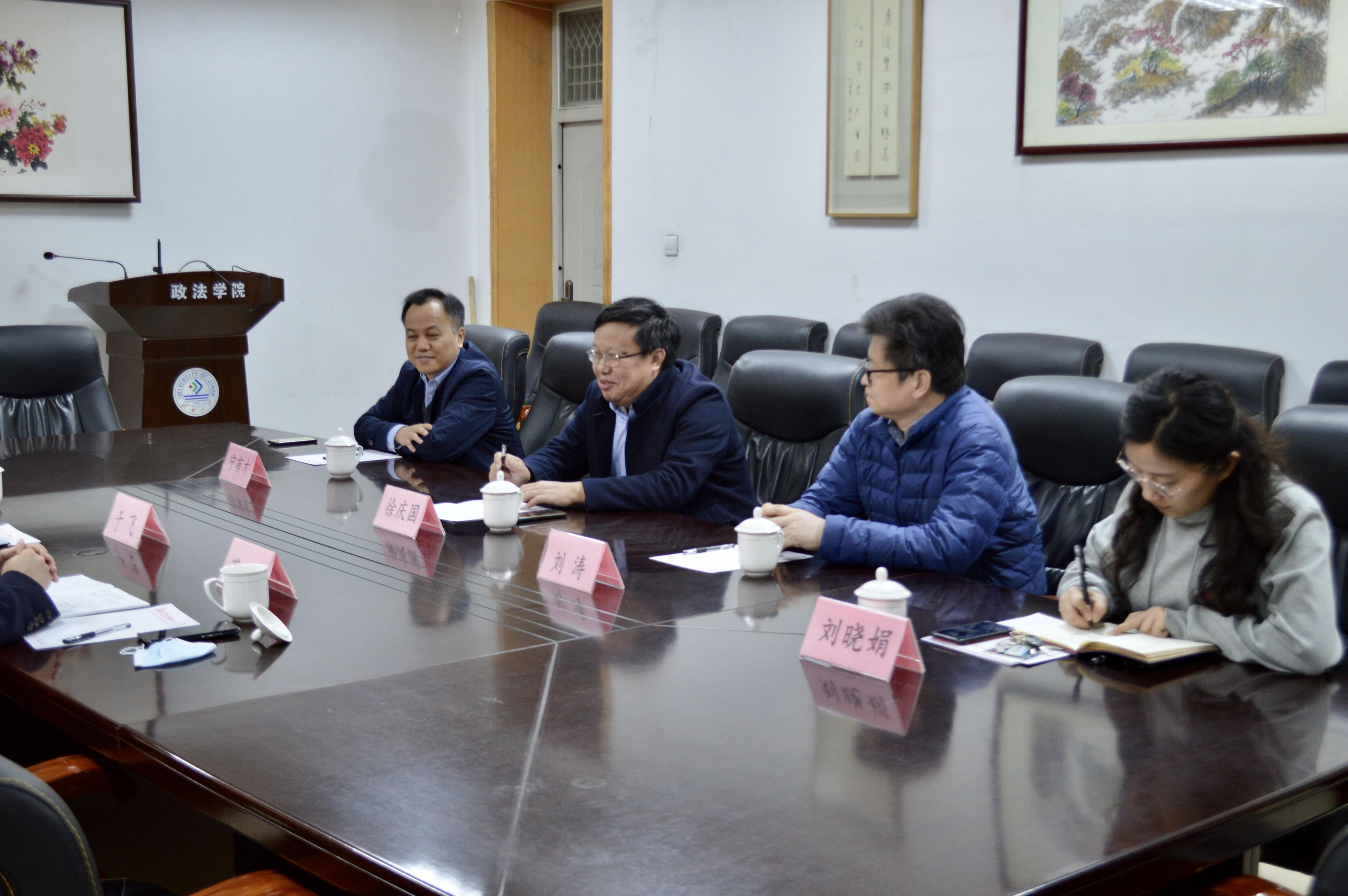 行管系校友于飞,到学院就校地合作进行座谈交流。学院党委书记徐庆国、培训办公室主任刘涛、行管系主任宁有才、辅导员刘晓娟参加座谈。