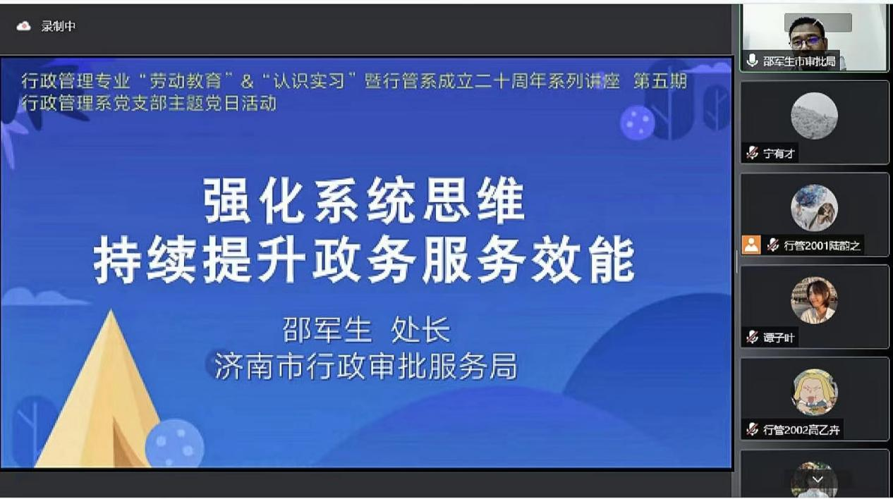 5月27日晚上,行政管理系“劳动教育”“认识实习”暨行管系成立二十周年、行管系党支部主题党日活动系列讲座第五期成功举行。本次讲座邀请到济南市行政审批服务局邵军生处长做《强化系统思维,持续提升政务服务效能》的主题报告。糖心视频