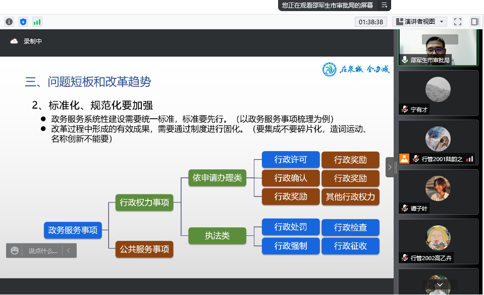随后,邵军生处长从政务服务政策介绍、政务服务评价体系介绍、问题短板和改革趋势和济南行政审批制度改革等四个方面进行深入详细的讲解。邵处长梳理了我国政务服务政策沿革,逐一讲解各项政策的特点和主要目标,重点分析营商环境评价和一体化政务服务能力评估指标体系,深刻剖析当前政务服务改的问题短板以及未来改革的极简化、平台化、线上线下融合一体化趋势,指出济南行政审批制度改革在于着力构建部门、区域、层级、社会多元主体四个维度全方位协同配合的审批服务共同体,推出系列务实改革举措,持续提升服务效能。邵处长报告深入浅出,既有理论讲解也有实践分析,既有政策梳理又有务实操作,更有未来展望。