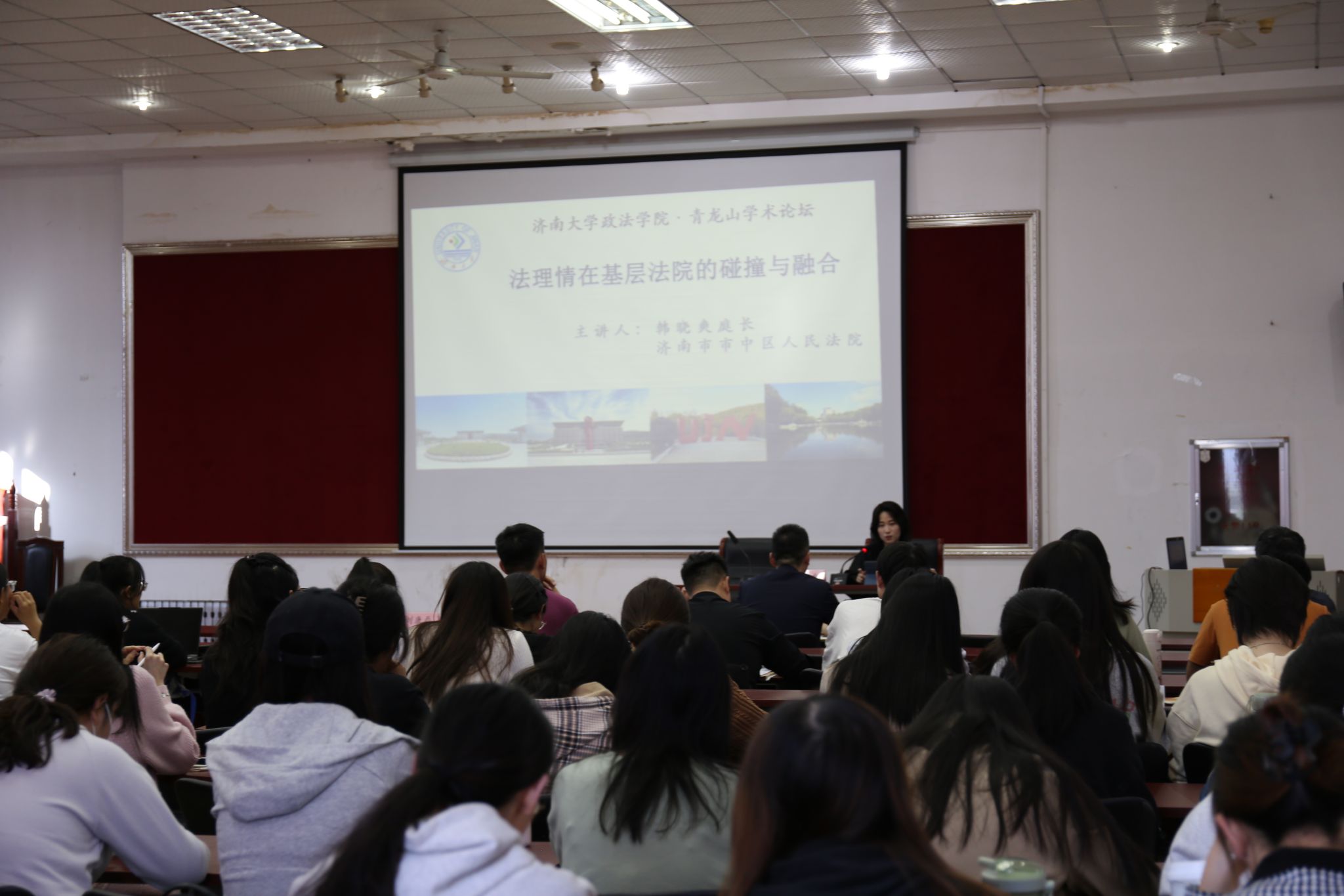 青龙山学术论坛在四教模拟法庭成功举办。济南市市中区人民法院立案庭韩晓爽庭长应邀做了题为《法理情在基层法院的碰撞与融合》的讲座。讲座由糖心视频