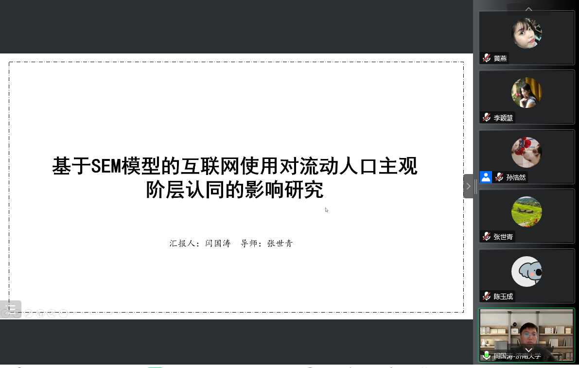 2022年第四期“滋兰苑”社会学研究生学术论坛在腾讯会议室成功举办。本次论坛邀请龚晓洁老师、邵金华老师、张银老师、胡艳蕾老师、张世青老师和陈玉成老师担任点评嘉宾,全体社会学研究生参加,院研究生会竞赛部孙浩然同学担任主持。