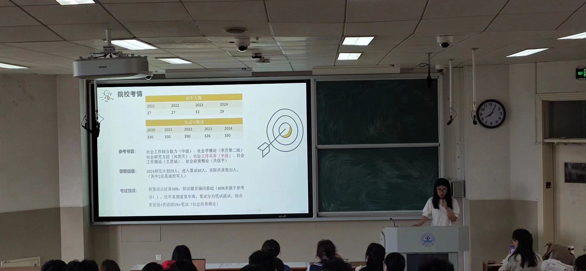 社会学系、系党支部在第十一教学楼2段402举办2024年考研经验分享会。本次考研经验分享会由邱莉老师主持,许淑华老师和社会学系21级、22级近140名学生参加了本次活动。