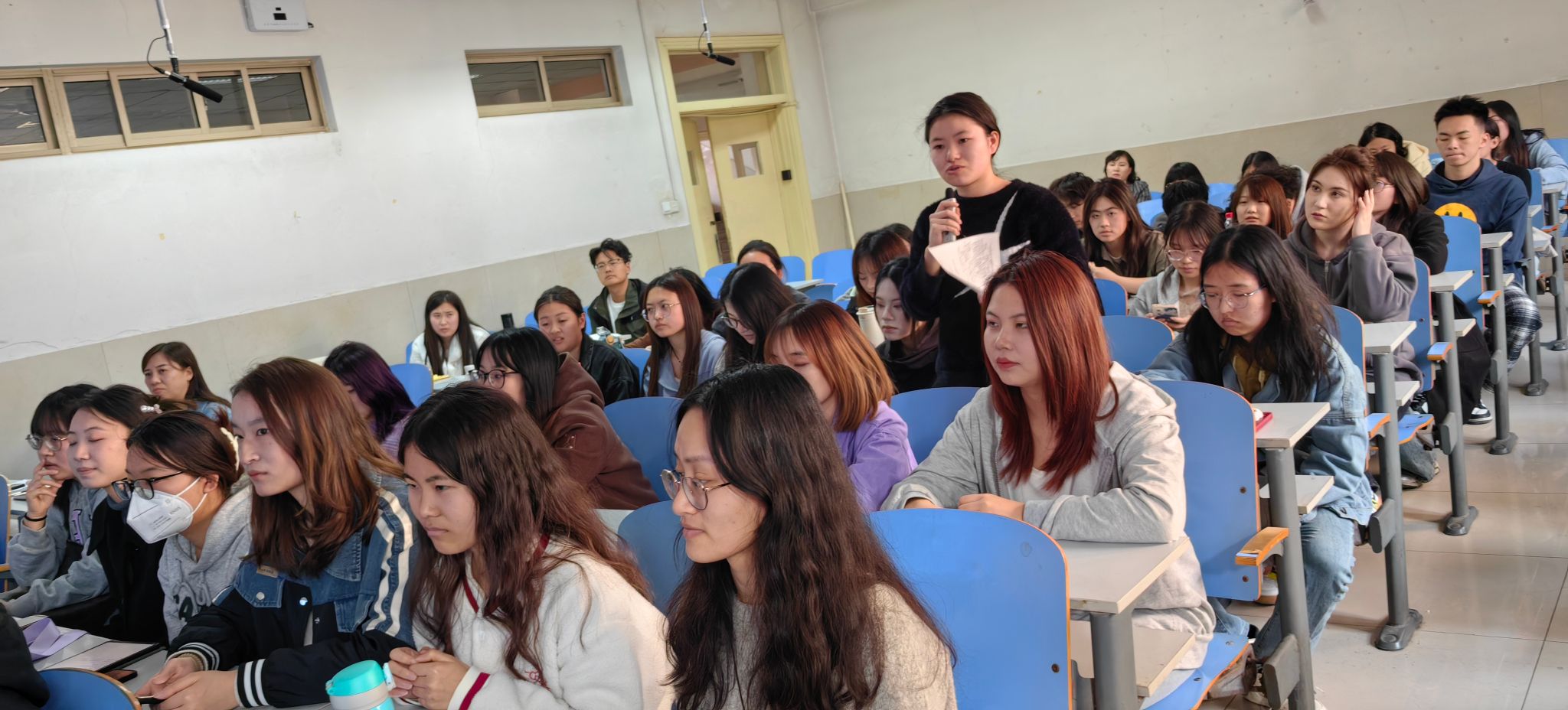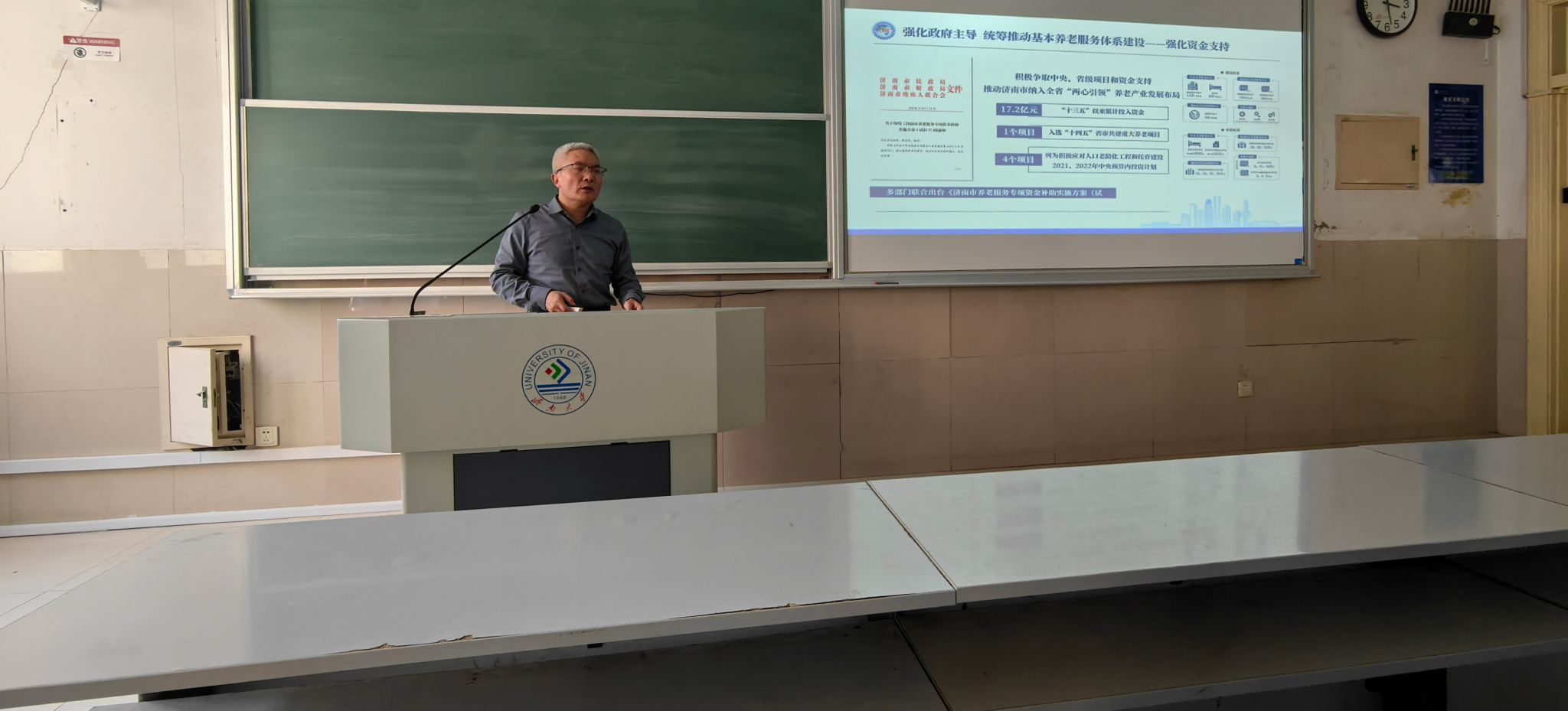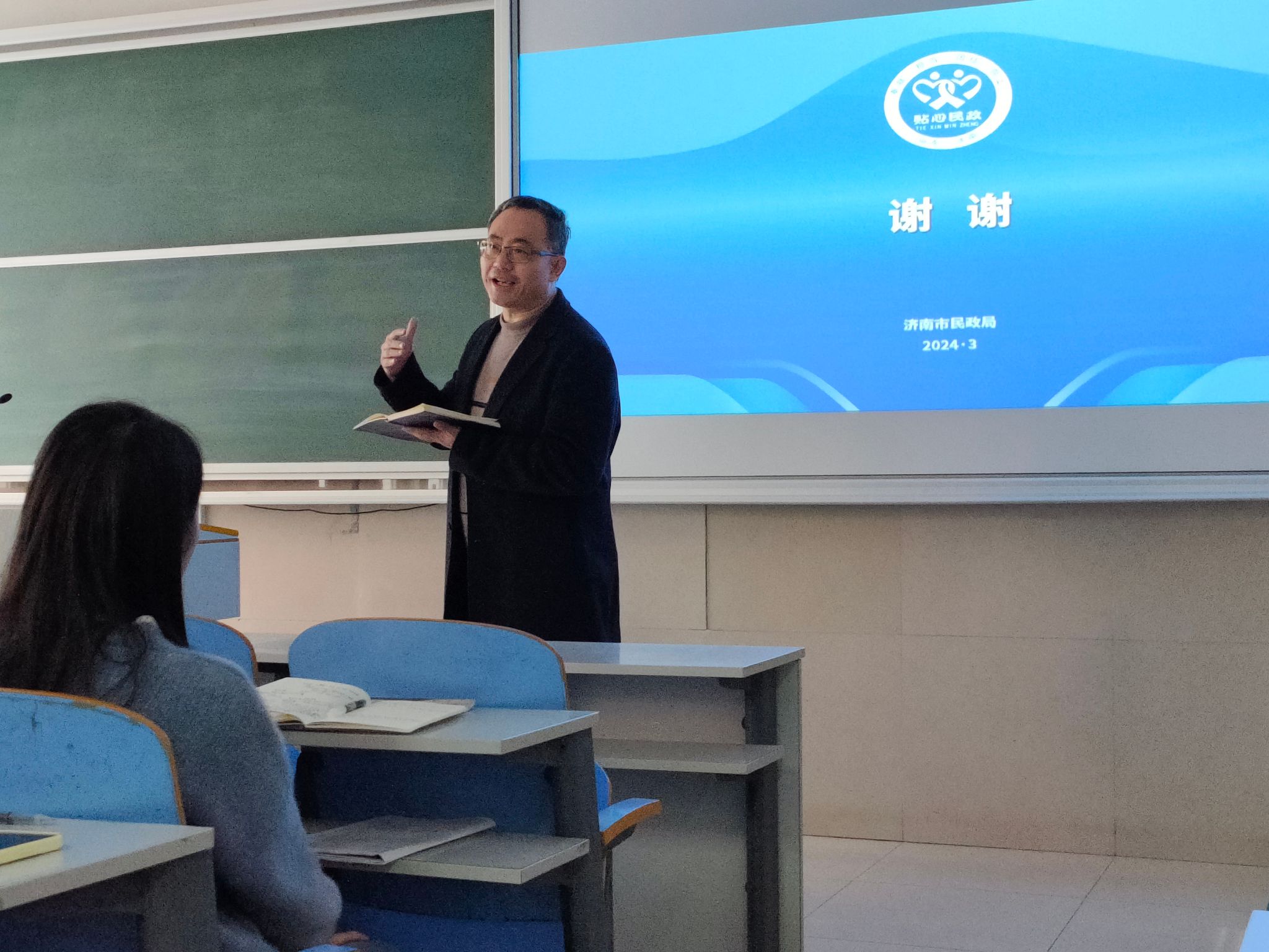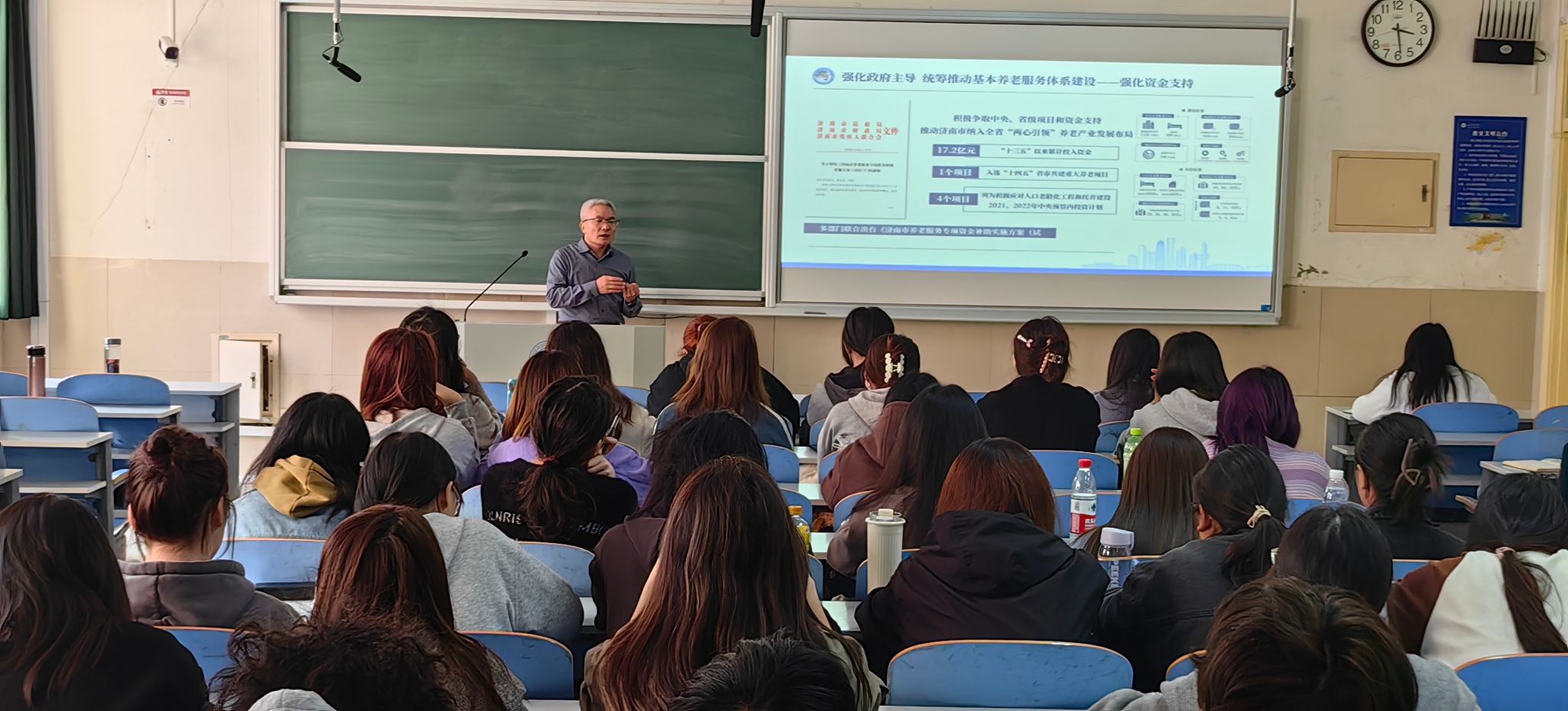 本次讲座的主题是“坚持四个强化——健全完善基本养老服务体系”。济南市在养老兜底保障、发展普惠型养老服务、完善社区居家养老服务网络等工作成效明显,走在全省全国前列。在2022年度全省公共服务质量监测中,济南市养老服务工作综合评价得分全省第一。2023年,济南市被国务院确定为“2022年度养老服务体系建设成效明显的表扬激励城市”,是全国10个被表彰奖励的城市之一。分管济南市养老服务工作的孔彬处长首先介绍了我国、山东省以及济南市人口老龄化的现状和趋势,然后运用翔实的数据和典型的实例介绍了济南市健全完善基本养老服务体系的工作经验,一是强化政府主导,统筹推动基本养老服务体系建设;二是强化工作创新,构建覆盖城乡基本养老设施网络;三是强化政策支持,健全完善基本养老服务制度;四是强化综合监督,提高基本养老服务品质。通过他的讲授,同学们不仅了解了济南市养老服务体系的“四梁八柱”,即“广覆盖、全纳入”,“重刚需、补供方”“分类补、提能力”,“分级担、重长效”,“抓规范、保公平”,而且对于本专业在养老服务体系构建中的作用有了初步认识。在讲座的尾声,学生们积极踊跃地向孔处长提问,孔处长耐心细致地一一解答。