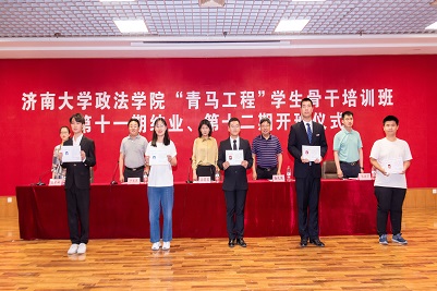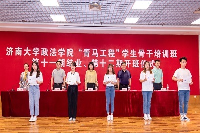 党委副书记、副院长于龙泉宣读《关于准予第十一期“青年马克思主义者培养工程”学生骨干培训班学员结业的决定》,96名学员认真完成培训任务,顺利结业。与会领导老师为第十一期青马班25名优秀学员颁发证书。第十一期青马班学员代表齐志良回顾了自己在青马班一年来的收获,从理论学习、社会实践、科技创新、志愿服务四个方面分享成长经历。第十二期青马班新学员代表杨舒雯表达了自己加入青马班的热切愿望,表示将珍惜学习机会,认真参加培训,努力做到对创新理论的学思用贯通、知信行统一。