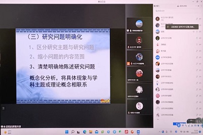 刘晓娟老师对邱莉老师的讲解作了充分补充,同学们也对“在选题判断上,是否一定要选择热点?”“科研队伍成员如何组合”等现实问题进行提问,刘晓娟老师和邱莉老师以往届学生的优秀科研项目为典例,以“将自己身边的问题与热点问题相结合,在生活中多提问、多思考”“建议低年级同学入门科创先跟从高年级同学了解具体的工作细节,再自己带领队伍做调研会更好”等建议对同学们的疑难点一一进行了答复。最后,邱莉老师和刘晓娟老师分享了开展科创调研工作的现实意义,鼓励同学们多多参与科研,从科研中提升自己,激发自己的潜能,锻炼自己的个人素质。值此防控新冠疫情反扑的紧要关头,老师们的话语如春风送暖,拨开了同学们头顶的沉沉迷雾,重新点燃了政法学子心中投身科研事业的熊熊烈火。