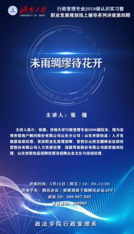 5月15日上午,行政管理专业2018级认识实习暨职业发展规划线上辅导系列讲座第四期如期进行。本期辅导讲座很高兴邀请到行政管理专业2008届张强学长,讲座题目是《未雨绸缪待花开》。学院正处级组织员国迎春、行管2018级全体同学、其他年级部分同学在线参加。讲座由宁有才老师主持,采用腾讯会议网络平台。