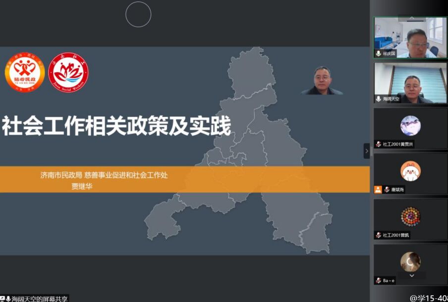 2020级社会工作专业认知实习“社工面对面”第一场线上讲座如期举行。济南市民政局慈善事业促进和社会工作处贾继华处长应邀作了题为《社会工作相关政策及实践》的讲座,讲座由学院党委书记徐庆国主持,社工专业200余位师生在线参加。