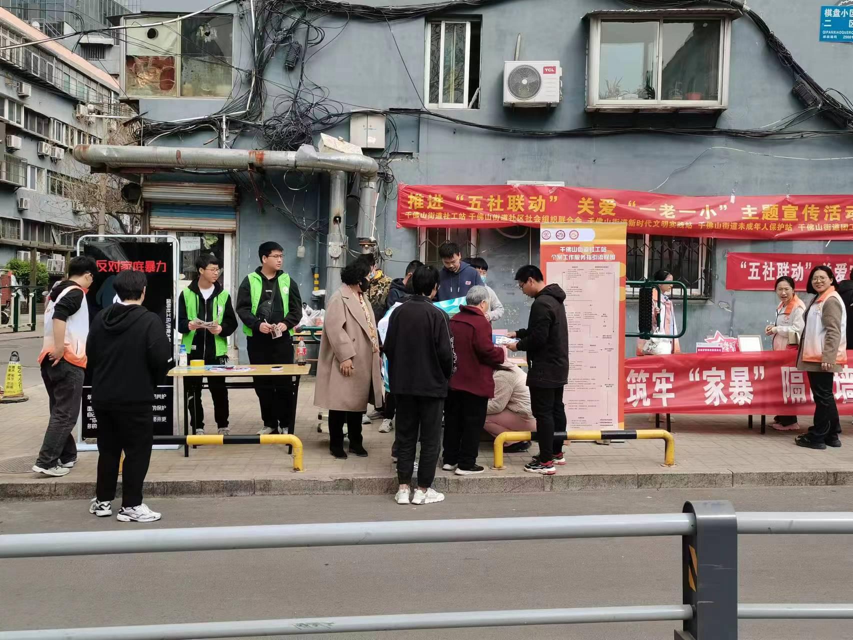 为迎接国际社工日的到来,结合民政部推进“五社联动”关爱“一小一老”的宣传活动主题,我校社会工作专业21级、22级实习生与山东青年政治学院、千佛山社工机构合作,于3月23日下午在千佛山街道棋盘街社区开展了以“反对家庭暴力,保障老年人与未成年人权益,促进家庭社会和谐发展”为主题的宣传活动。