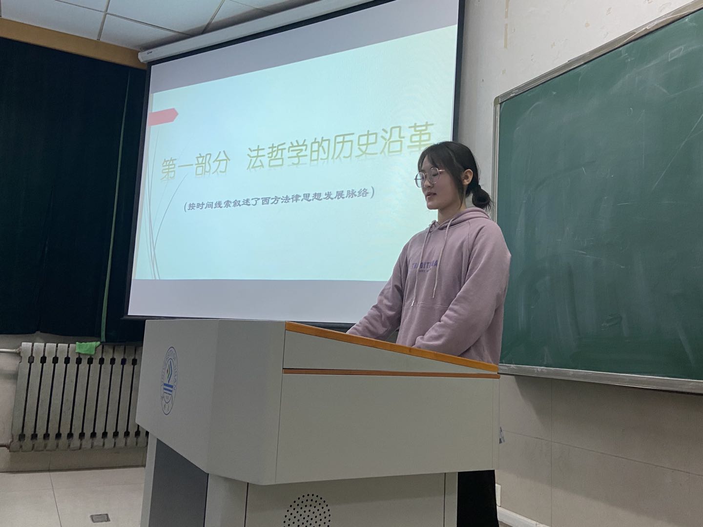 第一位上台的王文静同学,向大家推荐了E·博登海默的《法理学——法哲学及其方法》一书。她按照本书的内在逻辑结构,从历史概论、法律的本质和作用以及法律的渊源和技术三个角度详细剖析,让同学们在复习了法理学知识的同时更加全面地了解本书。第二位分享法治知识的刘柏君同学,对“十秒ko两人是否构成正当防卫”这一热点问题进行了详细的案例分析。她将本次事件分为两个阶段,并对两个阶段行为的主客观原因以及防卫限度等条件进行了详细的阐述,并抛出前一阶段属于正当防卫而后一阶段属于防卫不适时的观点,同时以于欢故意伤害案、昆山反杀案做为本案例的对比,为同学们提供了一个新颖独特的案例分析角度。第三位分享法治知识的许莹莹同学,也就此案例进行了剖析,并抛出了另一种观点。她将正当防卫的构成要件逐一列举,认为相某的行为未满足其中某些要件,所以其ko行为不构成正当防卫。许莹莹同学以幽默的讲述方式,不仅带同学们复习了上学期的刑法知识,也为大家提供了又一观察角度。第四位张璇同学认为此案例中相某的行为构成正当防卫。她适当地融情于法,将正当防卫以及防卫过当行为进行了详细解释,阐明了自己的观点。