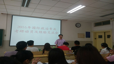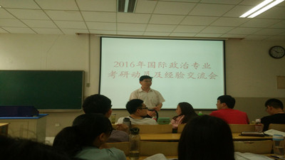 国政系的发展历程以及办学经验,阐明国际政治专业“高目标引领、精英化培养、小班型教学”的培养理念。随后国政12级优秀考研学生代表黄森、吴菁菁、王志伟、盛守光四位同学分别介绍了自己的考研经验。学生代表主要从考研目标的确立,政治、英语、专业课的复习技巧,心态的调整,复习资料的推荐,平时学习的方法等几个方面为在场的同学进行了详细的分享和交流,并结合自身的考验经历为大家介绍了考研过程中的经验教训,使在场的学生都受益匪浅。在交流的过程中,两位老师也适时的进行补充和讲解,让在场的学生更加全方位的了解了考研的相关信息,同时也极大鼓舞了在场同学考研的信心。最后,李慧明老师对本次交流会作了总结,他鼓励学生为自己的今后做好规划和打算,希望每位学生都能选择更好的未来,拥有更加美好的明天!
