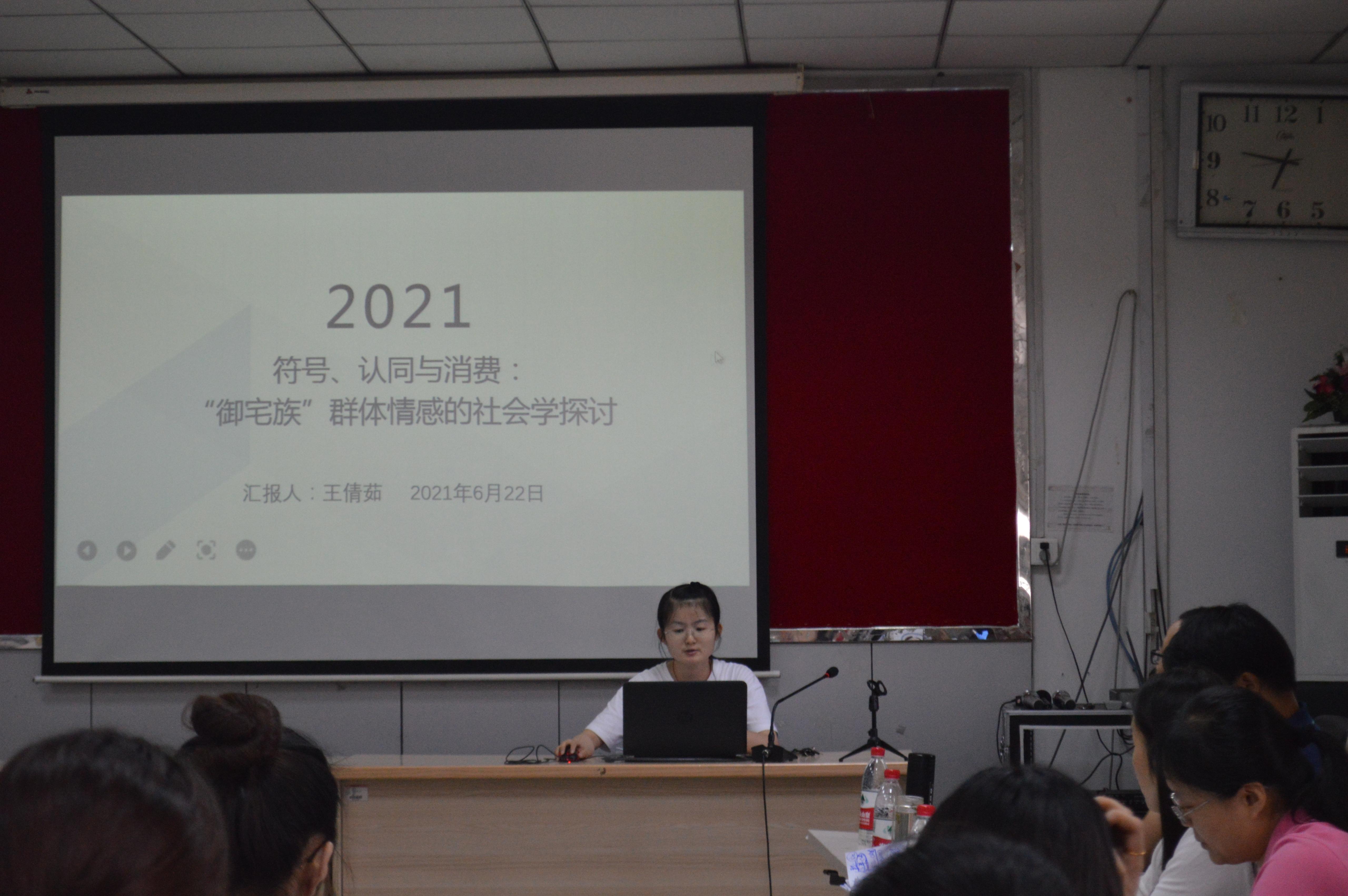 刘延飞、李洁璐、李梦爽、钱一民、王倩茹五位同学分别就题为《国内教育储蓄研究的热点主题和前沿演进——基于知识图谱的可视化分析》《社区邻里关系的影响因素与关系改善的对策建议》《趣味区隔视角下看快手“土味视频”的流行》《先赋性与获得性:“就近入学”政策促进了教育平等吗?》《符号、认同与消费:社会学视域下“御宅族”情感的建构机制》的论文进行了PPT展示与分享。四位老师从题目规范、理论运用、文章的深度与落脚点、研究方法等方面进行了充分的评价,并给出了具体可行的建议。