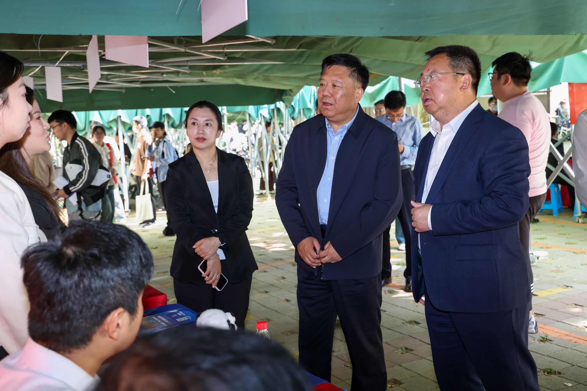 招聘现场,刘宗明、陈其军等与各个展位参会单位代表沟通交流,充分了解用人单位具体招聘需求与学生简历投递情况,了解学生的就业意向与就业过程中遇到的难题,鼓励学生充分做好就业准备,发挥专业优势,实现高质量就业。
