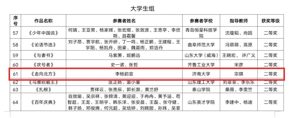 教师宗琪指导的,法学专业李杨韵宣同学的作品《走向北方》获大学生组二等奖,行政管理专业高霞同学的作品《红色家书》获大学生组三等奖。