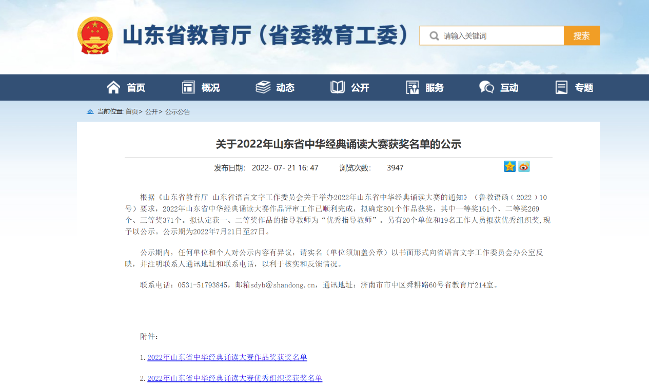 7月21日,根据山东省语言文字工作委员会办公室在山东省教育厅(省委教育工委)官方网站上发布的2022年山东省中华经典诵读大赛获奖公示名单,糖心视频
