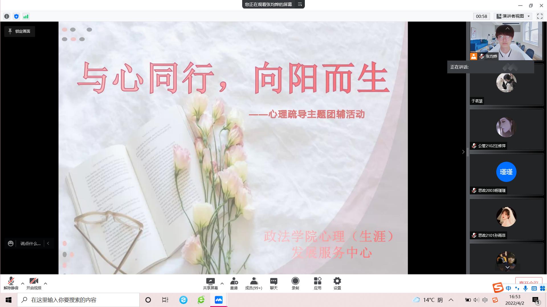 心理(生涯)发展服务中心于2022年4月2日借助腾讯会议以线上直播的形式组织了本次心理疏导团辅活动。