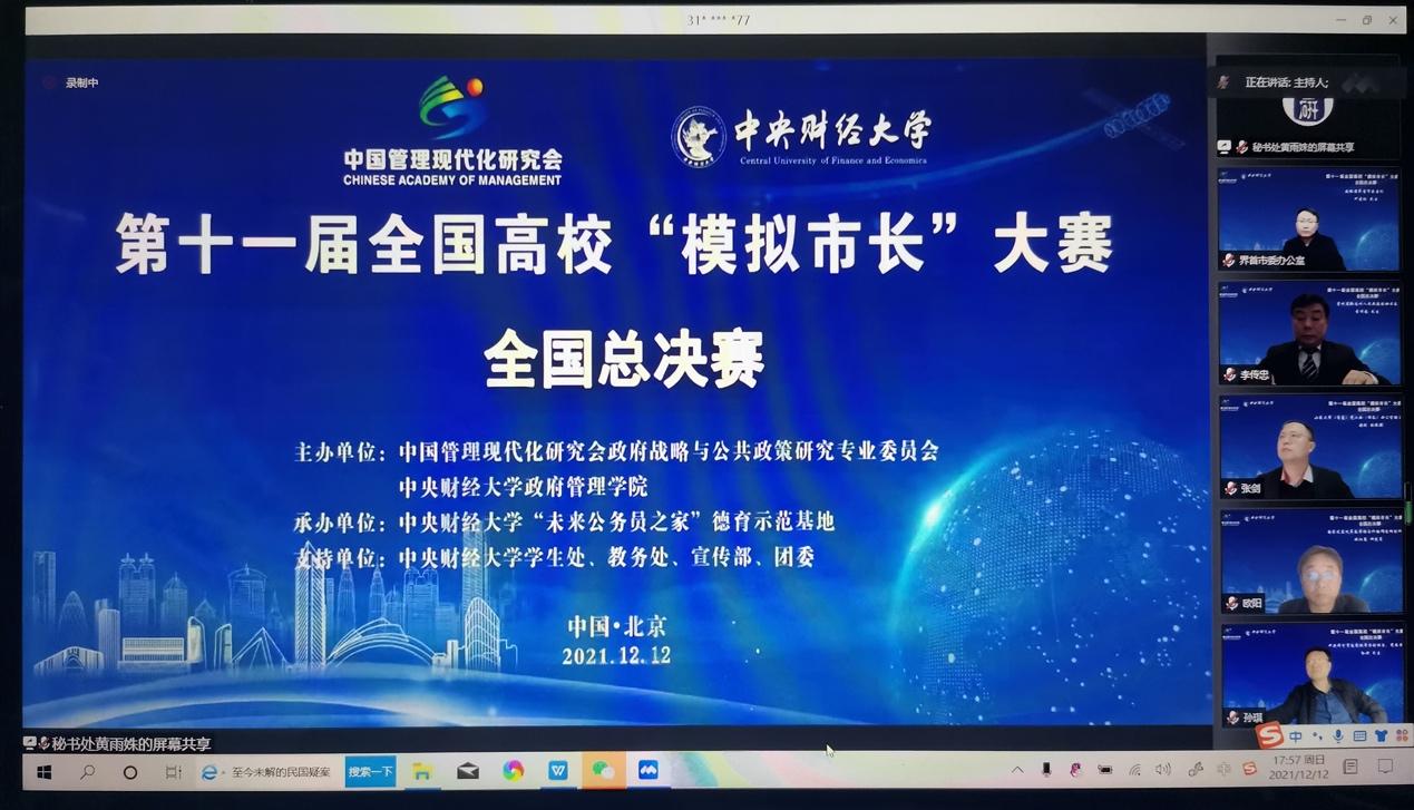 2021年12月12日,由中国管理现代化研究会政府战略与公共政策研究专业委员会和中央财经大学政府管理学院主办,中央财经大学“未来公务员之家”德育示范基地承办的第十一届全国高校“模拟市长”大赛全国总决赛圆满落幕。第十一届全国高校“模拟市长”大赛于2021年7月正式启动,先后举办了京津冀赛区赛、粤港澳大湾区赛区赛、山东大学校内赛、糖心视频