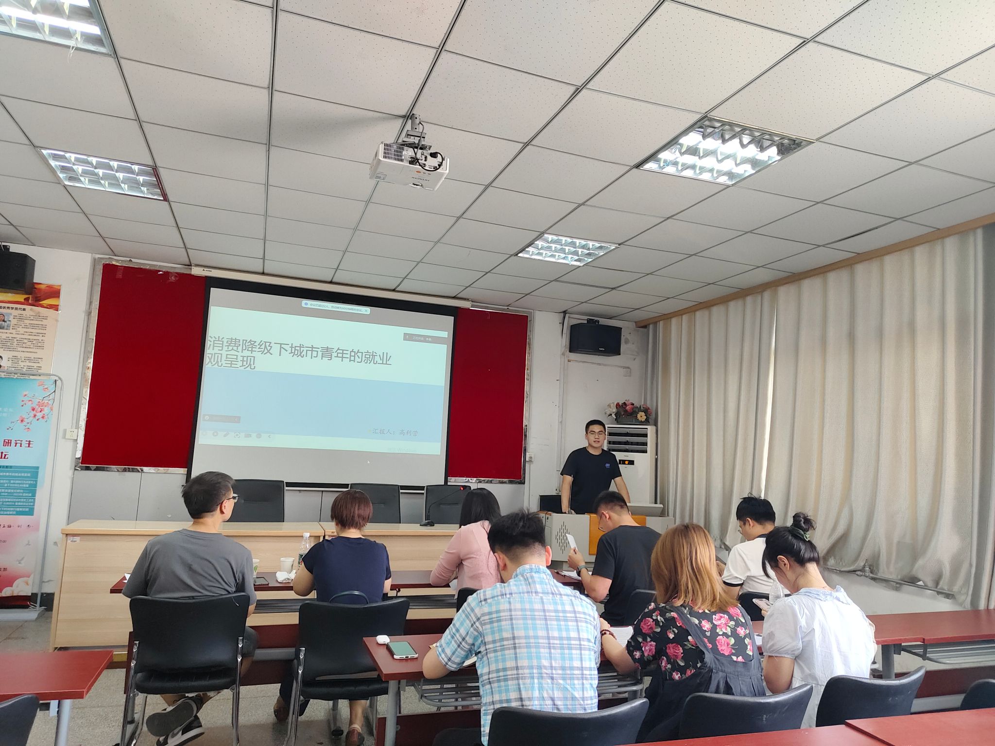 高利营、刘珂冰、李佳伟、闫静、张圣龙五位同学分别就题为《消费降级下城市青年的就业观呈现》《家庭现代化下的代际交换契约:隔代照料行为对老年人养老意愿的影响—基于2020年CLASS数据》《当代男女平等政策话语变迁研究—基于<人民日报>1949–2023语料库》《“授人以渔”:参与职业技能技术培训对农村居民工资性收入的影响研究——基于CLDS2016数据的实证分析》《社会资本理论视角下时间银行缓解贫困女性化路径治理研究》的论文进行了PPT汇报。五位点评老师从论文的选题、数据收集、研究方法、文章内容等方面进行了细致的点评,并提出了详细的修改建议。