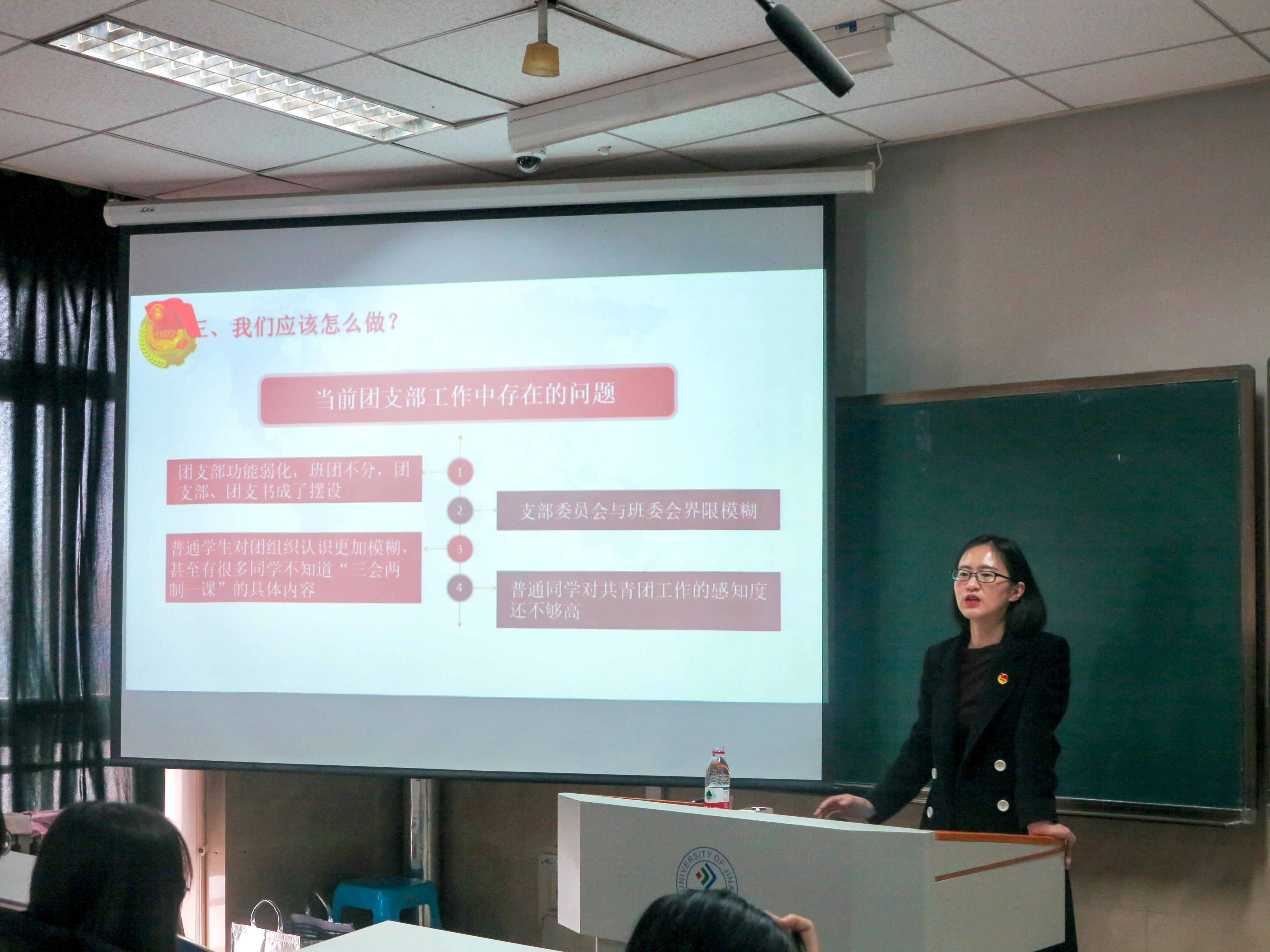 伴随着《光荣啊,中国共青团》青春向上的旋律,此次培训拉开了序幕。学院团委书记晁素娜以“做好一名新时代团干部”为题讲授第一课,她从“共青团的光辉历史”“共青团十八大及历次中央全会精神”“学院团委基本情况”“团干部的职责使命”等方面进行详细讲解,她指出团干部要牢固树立永远跟党走的理想信念,注重加强理论学习,不断提高理论素养,以团章和团支部工作条例为遵循,以“三会两制一课”和“主题团日”为抓手,不断提高团支部建设质量。