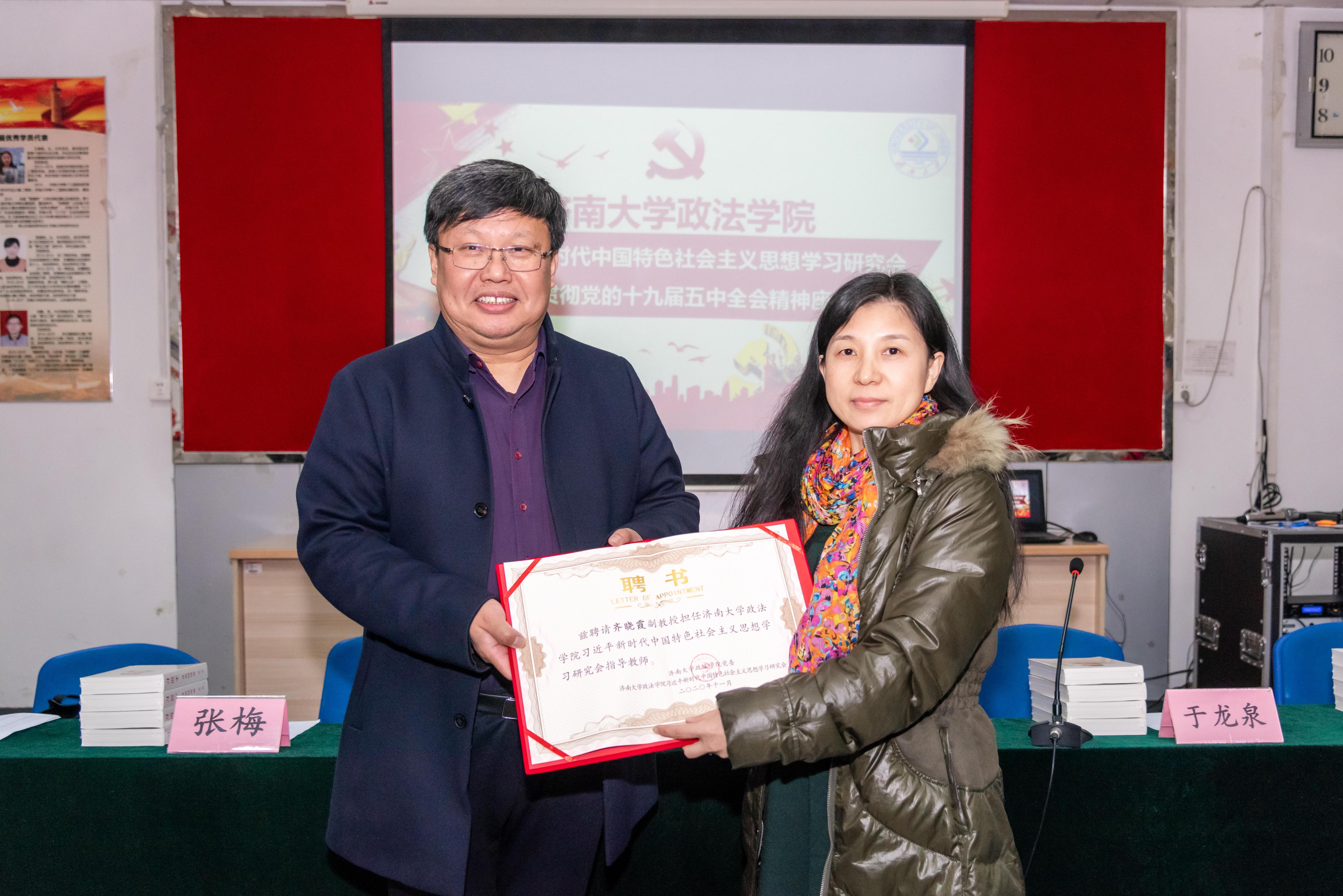 在“青马工程”学生骨干培训班基础上,成立了习近平新时代中国特色社会主义思想学习研究会。在当前认真学习贯彻党的十九届五中全会精神之际,学院从2018级、2019级本科生和研究生中选拔出31名政治素质高、综合能力强的学生干部,组成学习研究会新一届成员。为加强学习研究会建设,学院积极整合力量,发挥专业和师资优势,聘请刘雨辰、张梅、宁有才、齐晓霞、张荣、辛瑞萍6名教师担任学习研究会指导教师。学院正处级组织员国迎春宣读聘请决定,党委书记徐庆国为指导教师颁发聘书,与会嘉宾为每名学员赠送《习近平谈治国理政》第三卷。随后,各指导教师结合自身研究领域,分享学习党的十九届五中全会精神体会,与会师生围绕加强理论学习、促进学风建设、发挥学生干部模范带头作用等方面进行深入座谈交流。