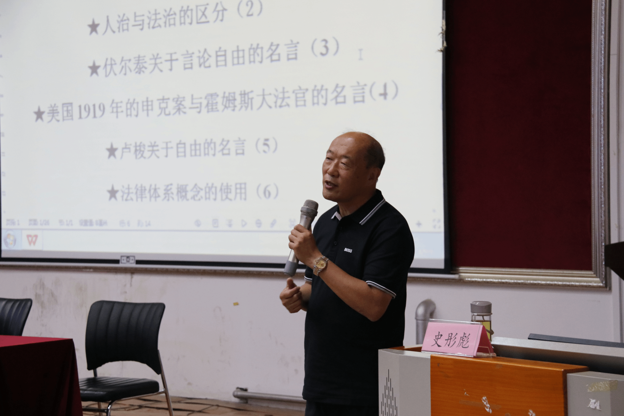 史彤彪教授从对丛林法则的解读、人治与法治的区分、伏尔泰关于言论自由的名言、美国1919年的申克案与霍姆斯大法官的名言、卢梭关于自由的名言、法律体系概念的使用、“法无授权即禁止”原理的运用等七个部分展开阐释。在第一部分,史教授认为在对丛林法则进行解读时要全面理解自然界的秩序,不要过滤重要内容,在人类社会中应当团结合作、互相帮助、互利互惠;在第二部分,史教授通过回溯中外历史来介绍人治与法治的关系,并认为与法治相对应的不是人治,而是专制。现代社会应当要法治,不要专制;在第三、第四和第五部分,史教授分别为大家介绍了伏尔泰、霍姆斯大法官和卢梭等关于自由的名言,并由此展开了对包括言论自由在内的自由之界限的探讨;在第六部分,史教授为大家讲解了法律体系特有的含义与用法,并介绍了我国现有的法律体系及其包括的法律部门;在第七部分,史教授从弃婴岛事件切入,对于公权力行使过程中的法无授权即禁止之原则应该如何理解与运用进行了详细介绍。