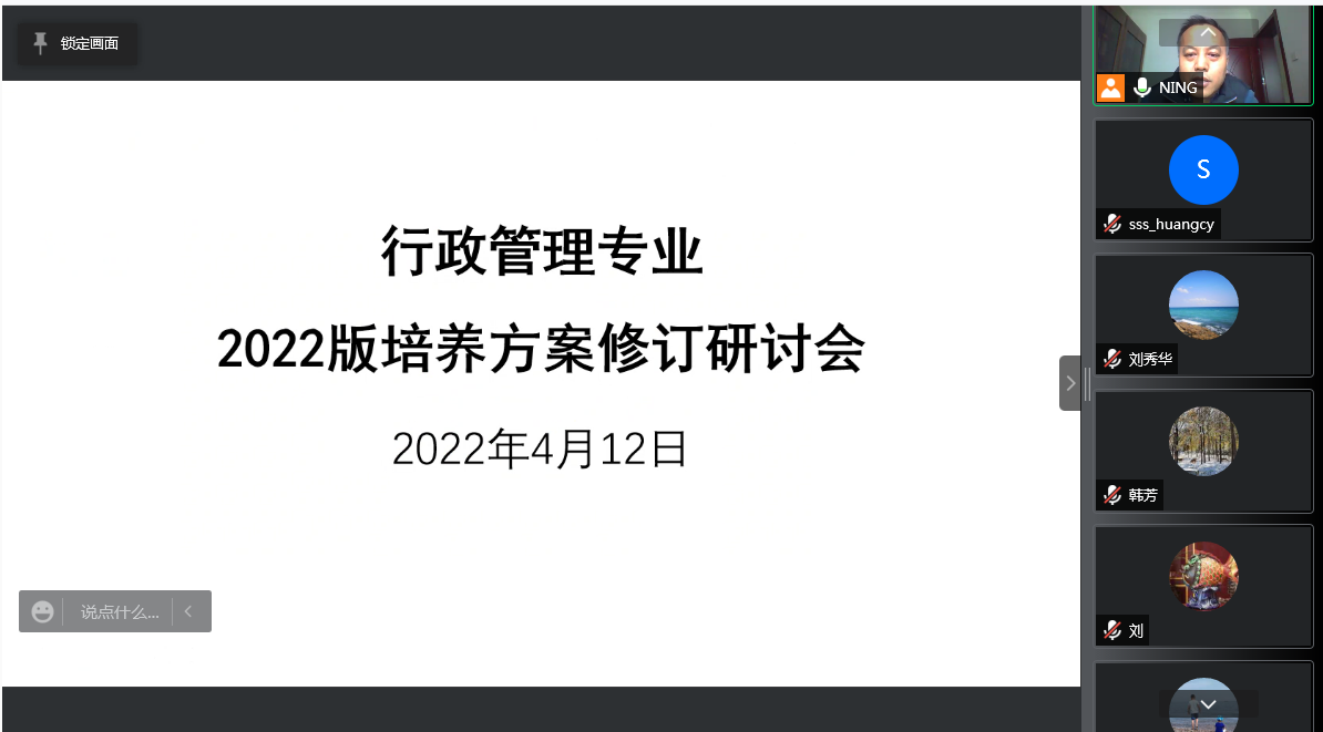 2022年4月12日下午,行政管理系举行2022版本科生培养方案修订线上研讨会。学院党委书记徐庆国、行政管理系全体教师参会。宁有才老师主持会议。