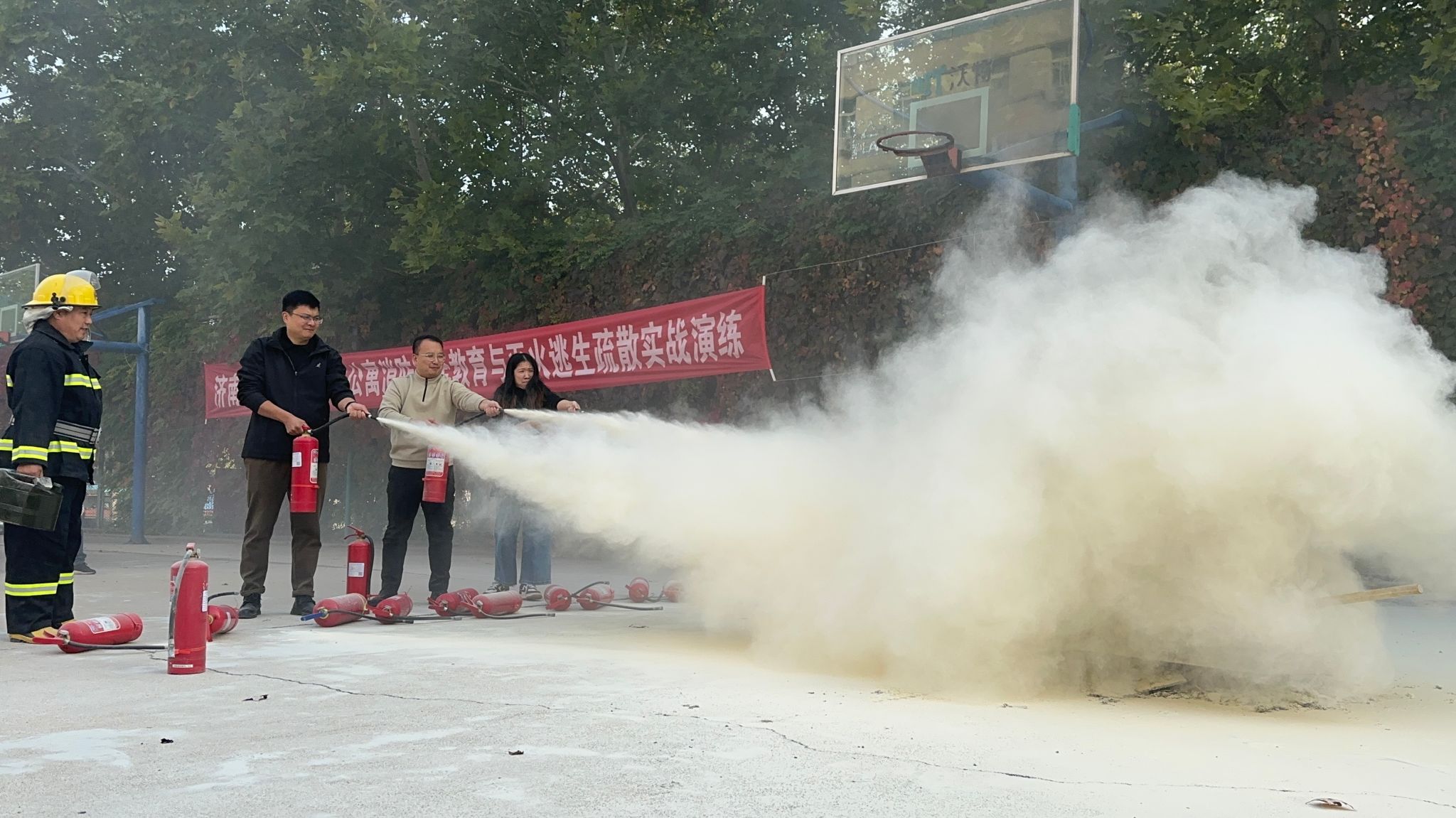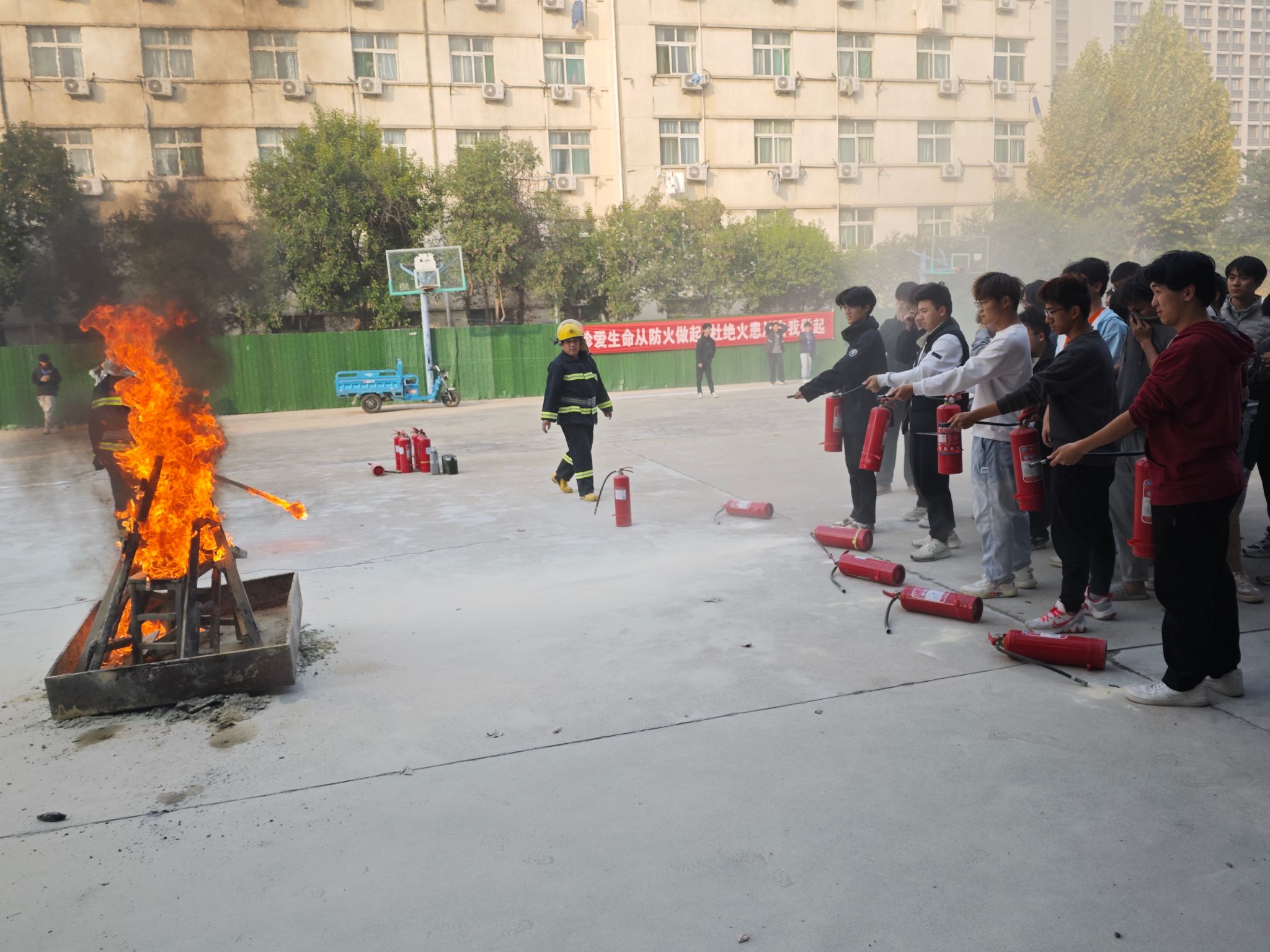 的师生分组进行了模拟灭火实战演练。大家认真学习并掌握了灭火器的正确使用方法,亲手操作灭火器进行扑灭模拟火源,有效提升了实际操作能力。