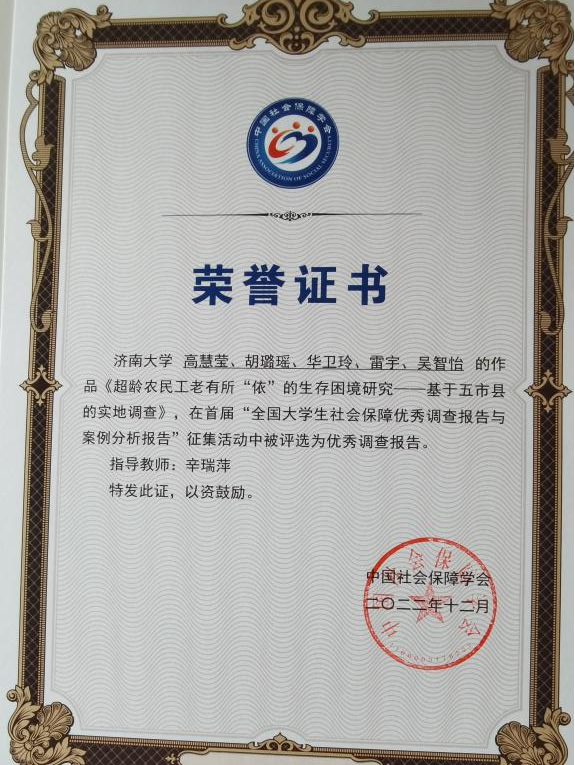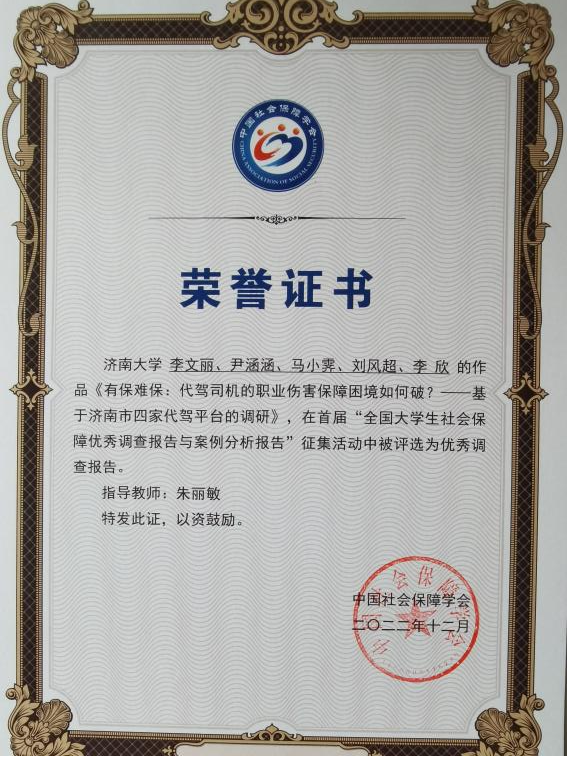 朱丽敏老师指导的社会学研究生李文丽、尹涵涵、马小霁、刘凤超、李欣团队的作品《有保难保:代驾司机的职业伤害保障困境如何破?——基于济南市四家代驾平台的调研》、辛瑞萍老师指导的劳动与社会保障专业本科生高慧莹、雷宇、胡璐瑶、华卫玲、吴智怡团队的《超龄农民工老有所“依”的生存困境的研究——基于六市县的实地调查》两项作品被评选为优秀调查报告,团队成员受邀参加成果交流会。