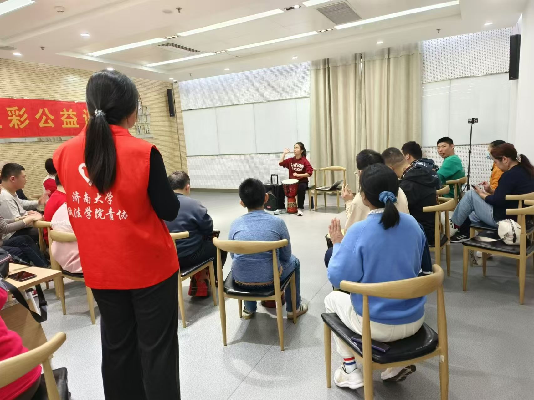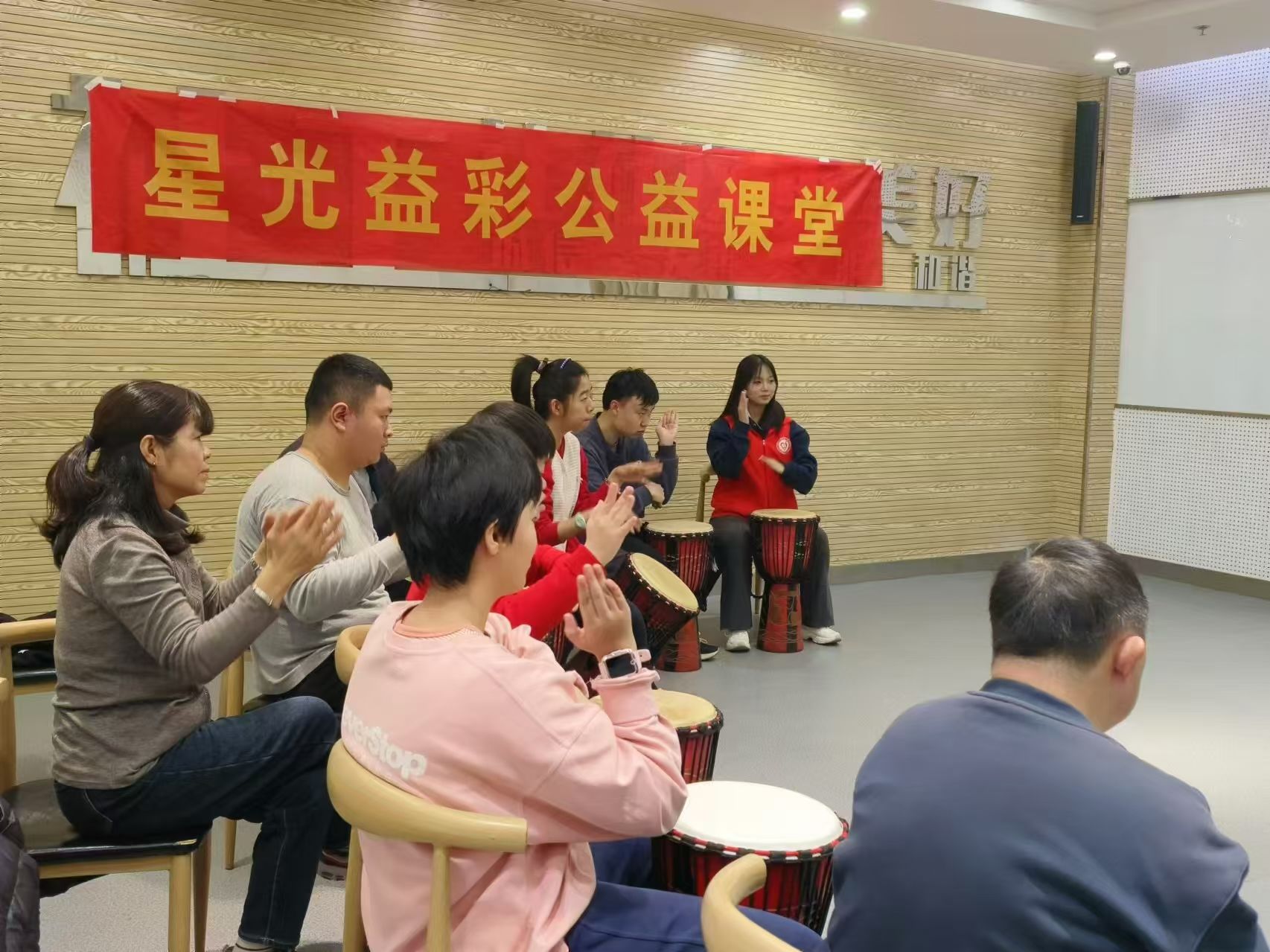 阳光先锋青年志愿者协会的志愿者于2024年11月9日前往济南市慧爱残疾人服务中心的星光艺彩公益课堂开展了一场非洲鼓公益课程,以提高残障人士的音乐技能,助力他们更好地融入社会。
