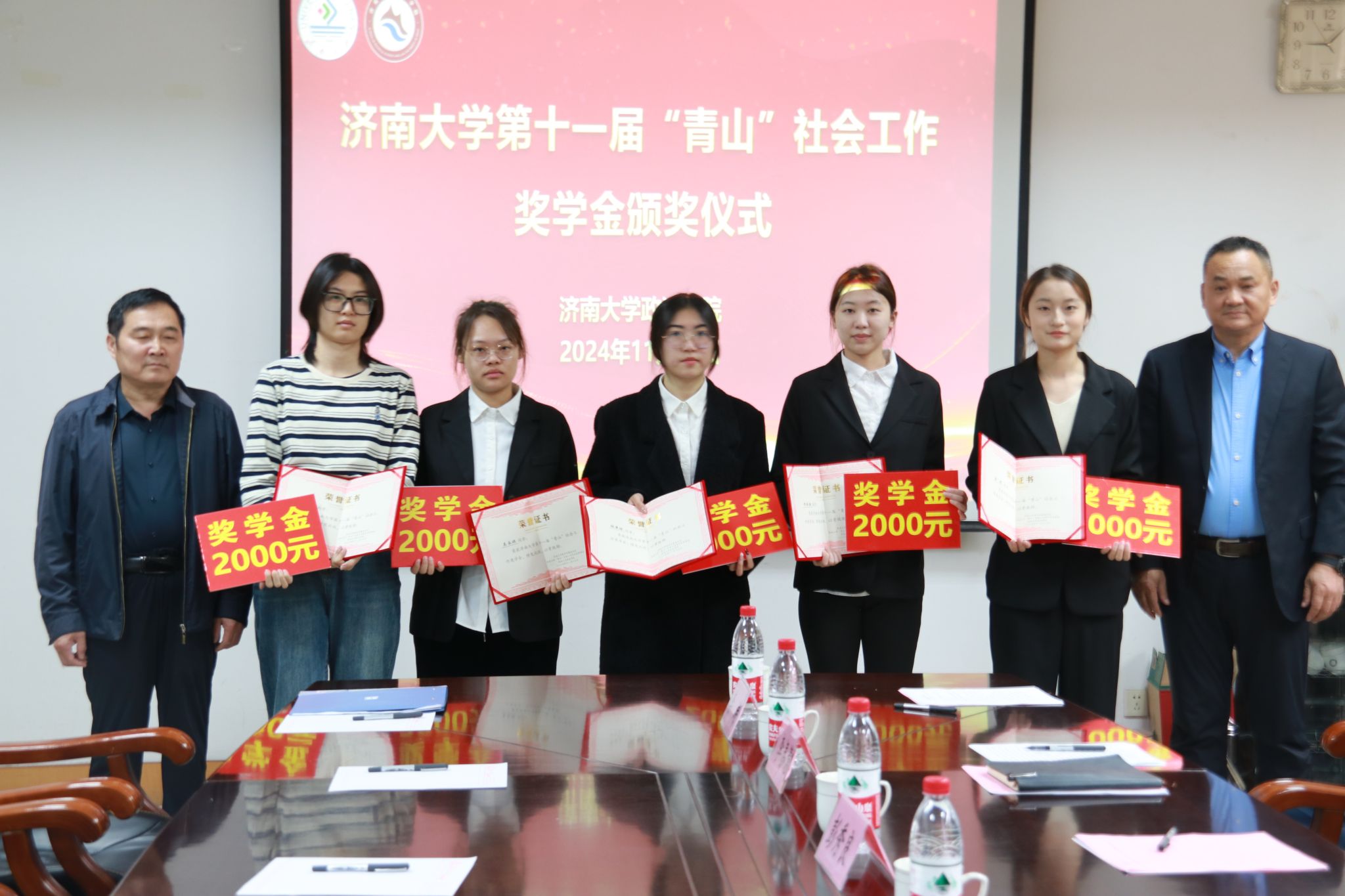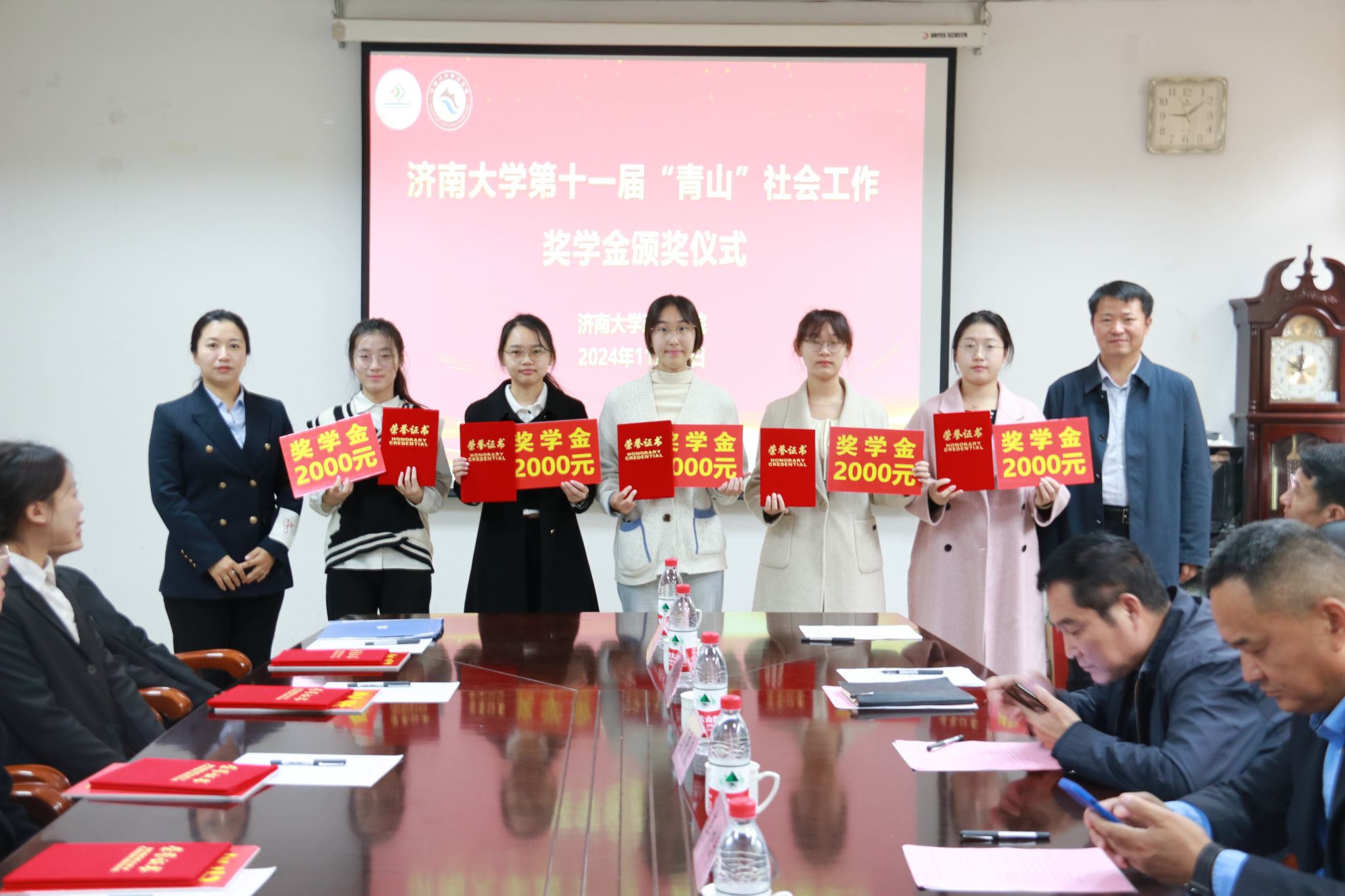 第十一届“青山”社会工作奖学金表彰决定,并勉励同学们发扬成绩、戒骄戒躁,追求卓越,在今后的学习工作中始终不忘专业责任。与会领导、嘉宾为社会工作专业刘丹阳、马浩月、王凯旋、闫世钰、国英慧,劳动与社会保障专业何昕怡、余丹、吴永琪、陈玉洁、林黄冰颁发奖学金及荣誉证书。