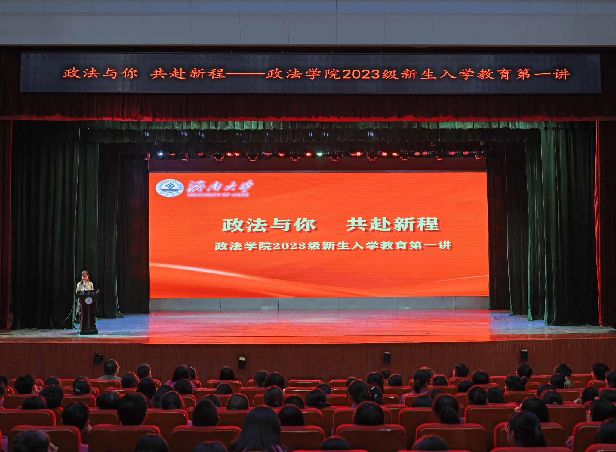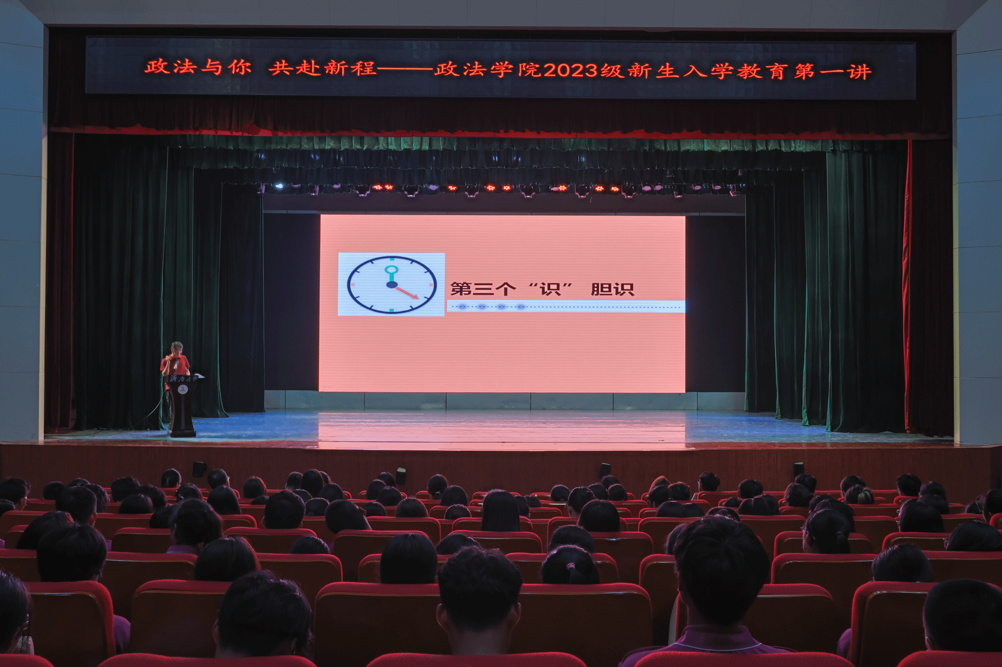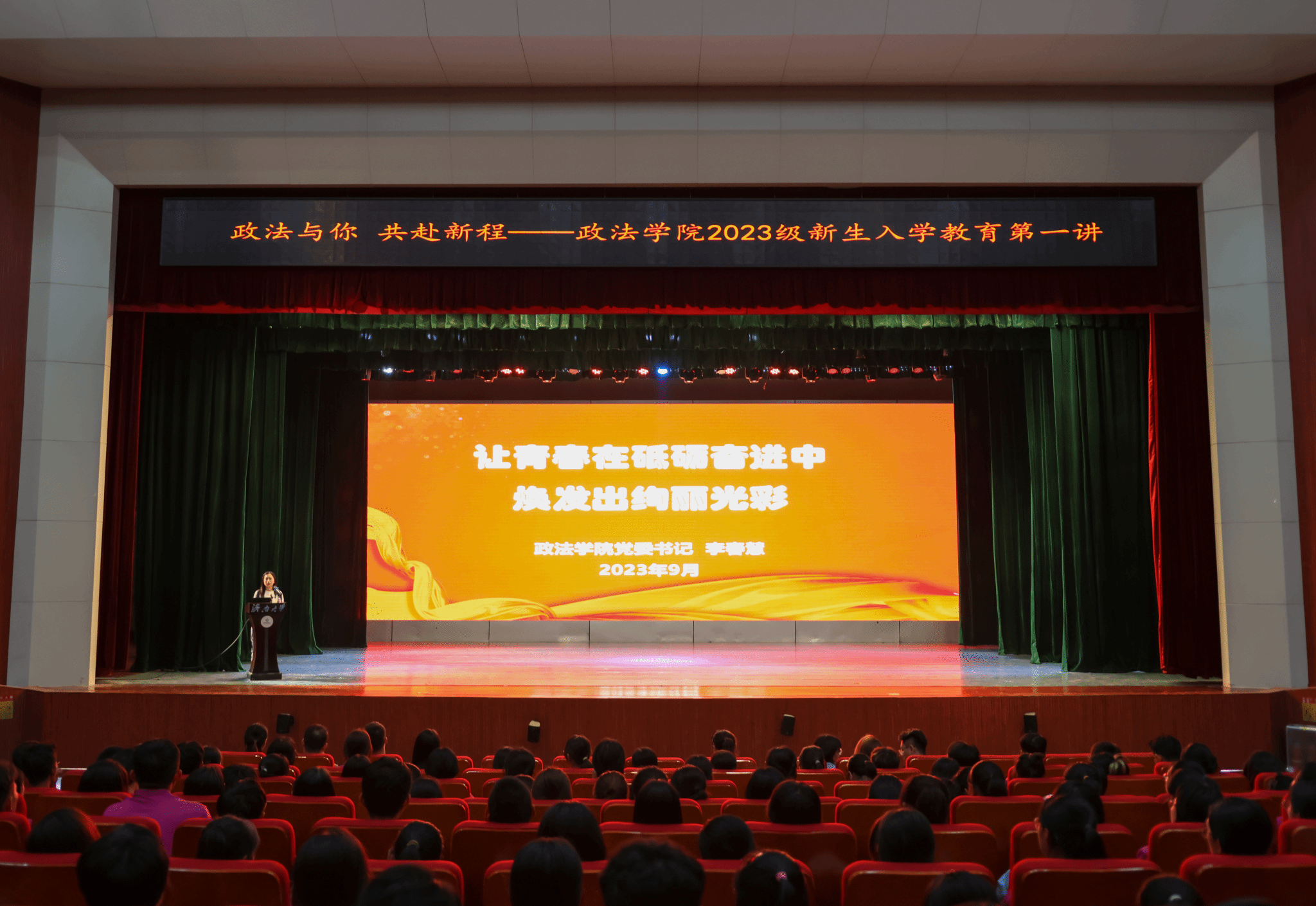 2023级新生入学教育第一讲在大礼堂举行。学院党委书记李春慧,党委副书记、副院长李涛,学生工作办公室主任黄茜,团委书记、2022级辅导员刘晓娟,辅导员迪妮尕尔·艾尔夏提、2020级辅导员赵朔、预科2301班辅导员艾尼瓦尔·亚森、2023级辅导员房仕琪、辅导员沈正浩出席本次本次活动,2023级全体本科生、研究生齐聚一堂,共同聆听学习。活动由2023级辅导员房仕琪主持。