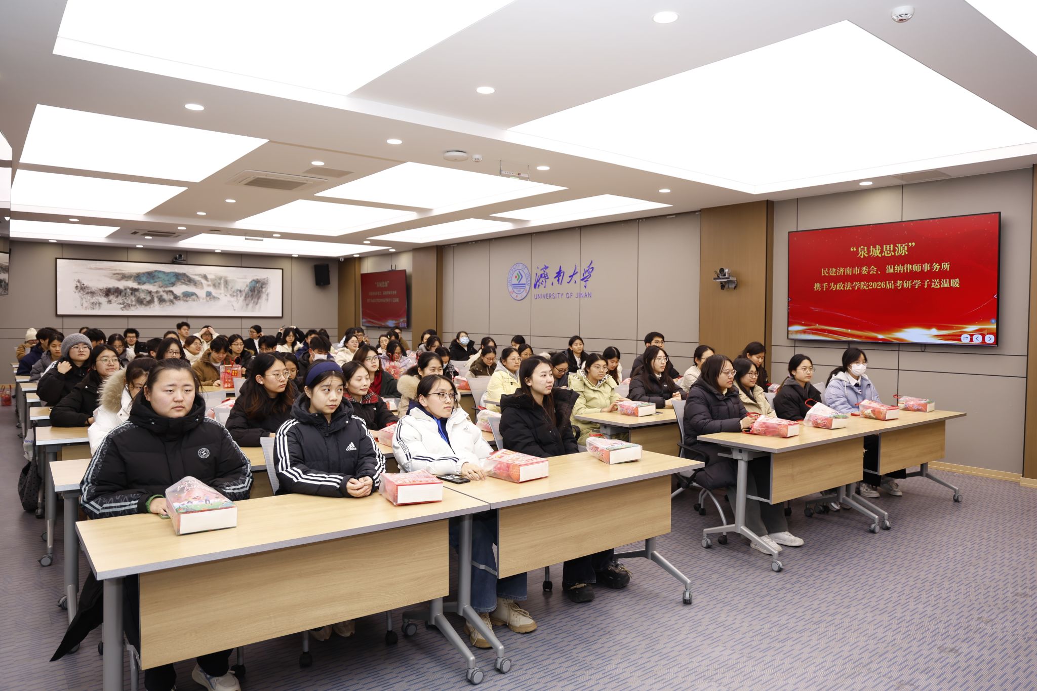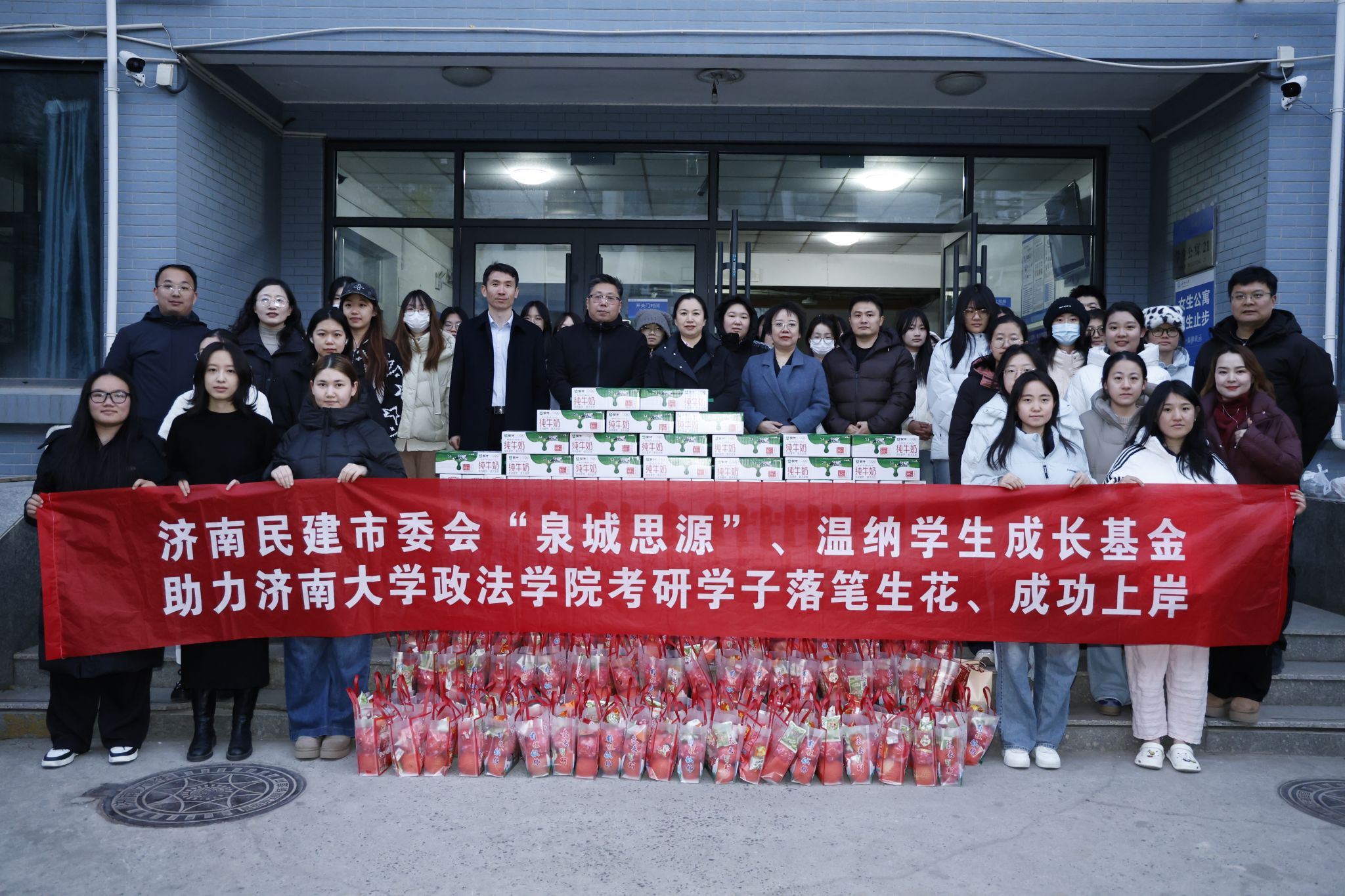 于12月2日开展为考研学生送温暖活动。学院党委书记李春慧,党委副书记、副院长李涛,全体辅导员,民建济南市委会常委韩炜,民建市中区总支委员、山东温纳律师事务所主任、我校法学专业2005届毕业生武磊,民建市中总支六支部副主委刘爽在第五学术报告厅开展考研动员会,与会领导到图书馆、学生第21号宿舍楼、第33号宿舍楼慰问考研学子。民建济南市委会“泉城思源”公益品牌携手山东温纳律师事务所为学生准备考研“加油包”。