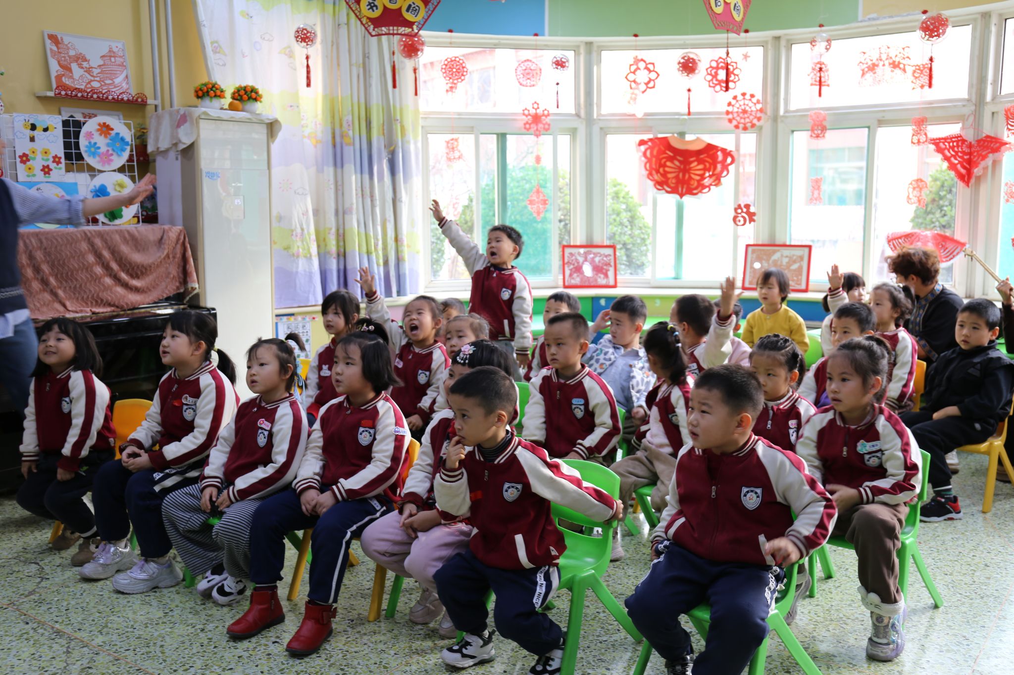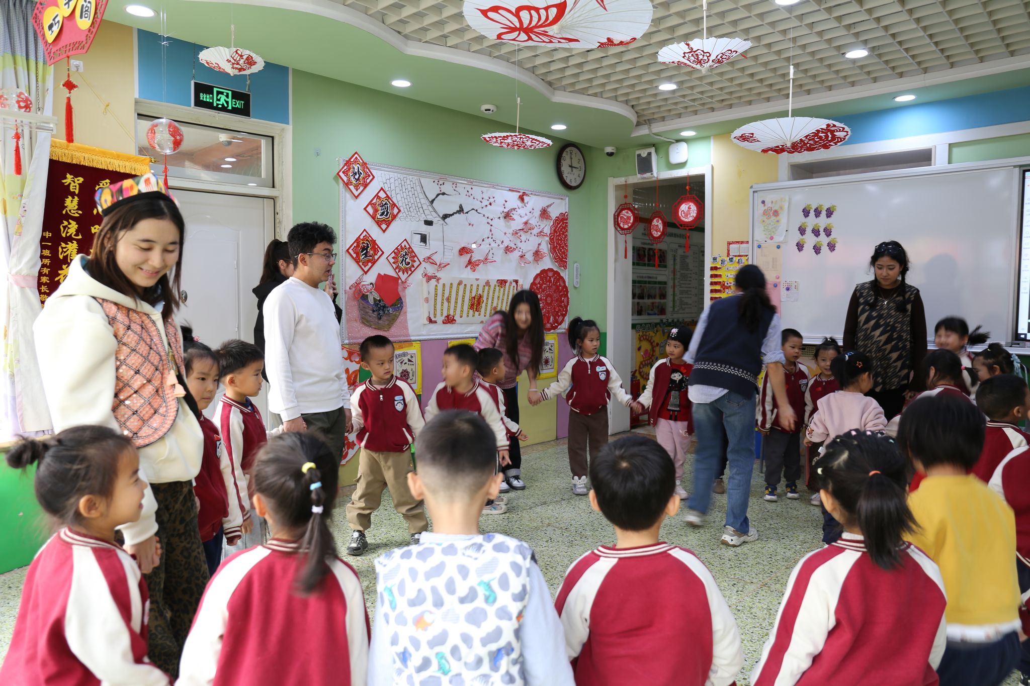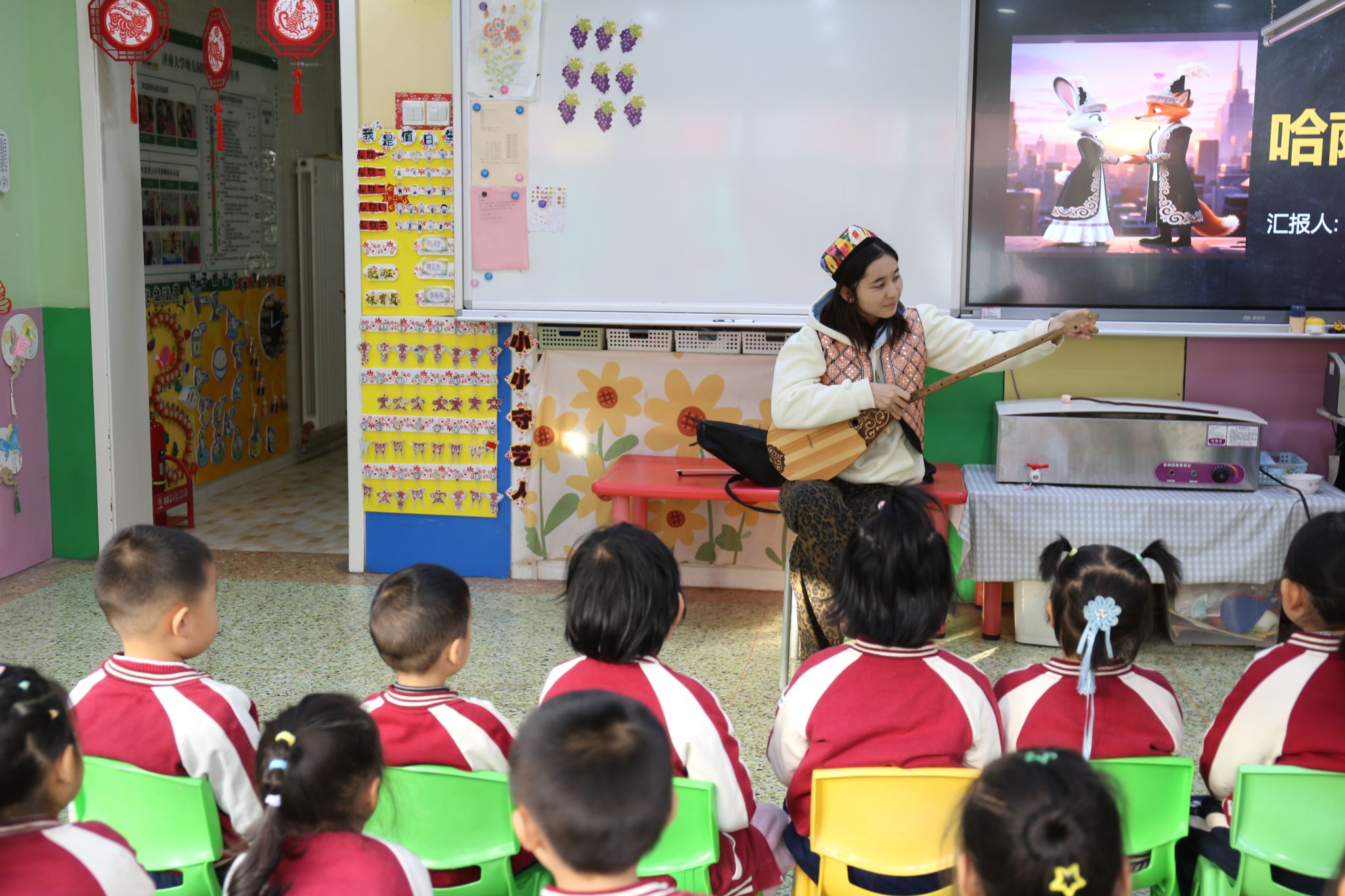 实践团成员围绕“认识少数民族”“了解少数民族风俗习惯、特色美食、传统乐器与歌舞”等主题各展所长,将民族团结理念融入生动活泼的教学环节,为幼儿带来了丰富精彩的教育体验。队员们充分调动幼儿学习的积极性与主动性,引导孩子们在玩中体验、在乐中感悟、在互动中学习。志愿者们分组开展活动:教小朋友们跳民族舞蹈、学说简单的民族语言、体验弹奏民族乐器等。石榴树下,大手牵小手共舞共学,掌心相触的温度让 56 个民族的团结故事悄然萌芽。一张张真诚的笑脸、一双双挥动的小手、一阵阵灵动的旋律,构成了各民族交往交流交融最动人的画面。这一刻,不同民族同心同向,“大学生” 与 “小朋友” 的距离也在欢声笑语中不断拉近。