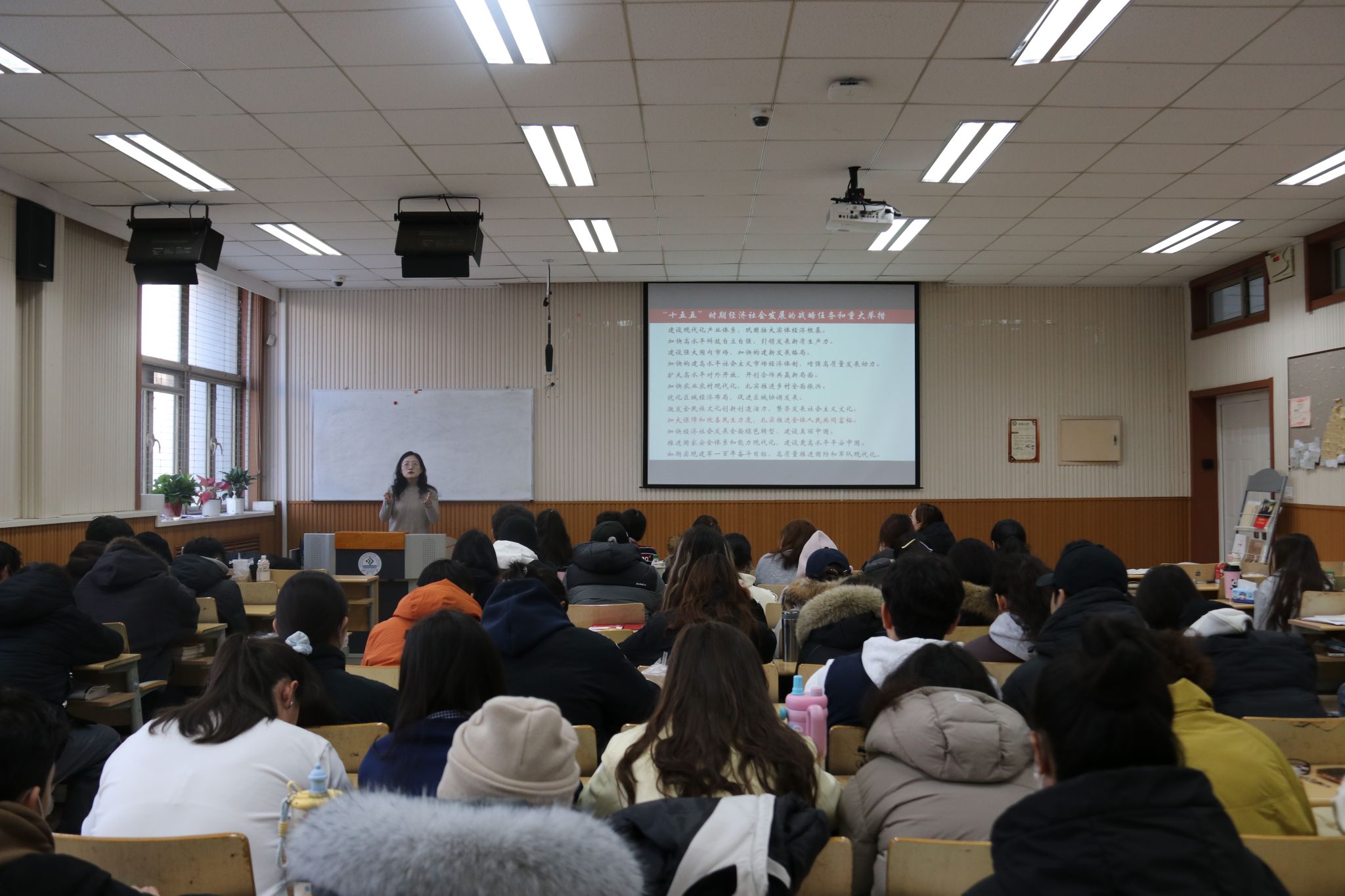 团委书记、山东省青年师生巡讲团成员刘晓娟以《奋进”十五五“青春正当时——学习贯彻党的二十届四中全会精神》为题,聚焦全会 “加快高水平科技自立自强” 的战略部署,生动阐释了 “十五五” 期间青年投身科技创新的时代使命,让学子们深刻认识到科创实践与校园文化建设在国家发展大局中的重要价值。刘老师强调,全会明确提出“支持青年科技人才创新创业”,大学生科创正是践行这一要求的鲜活载体。她鼓励大家将所学专业思维融入科创项目,在学科竞赛、课题研究中锤炼创新本领,真正把论文写在祖国大地上、把成果应用到发展实践中。同时,她指出校园文化是孕育创新的沃土,要以科学家精神为引领,营造敢闯敢试、互帮互助的创新氛围,让科创成为校园新风尚。最后,她号召同学们将全会精神转化为勤学善思、奋勇争先的内生动力,在科创实践与校园文化浸润中成长成才,以青春之我、奋斗之我为 “十五五” 规划实施、法治中国建设注入蓬勃生机。