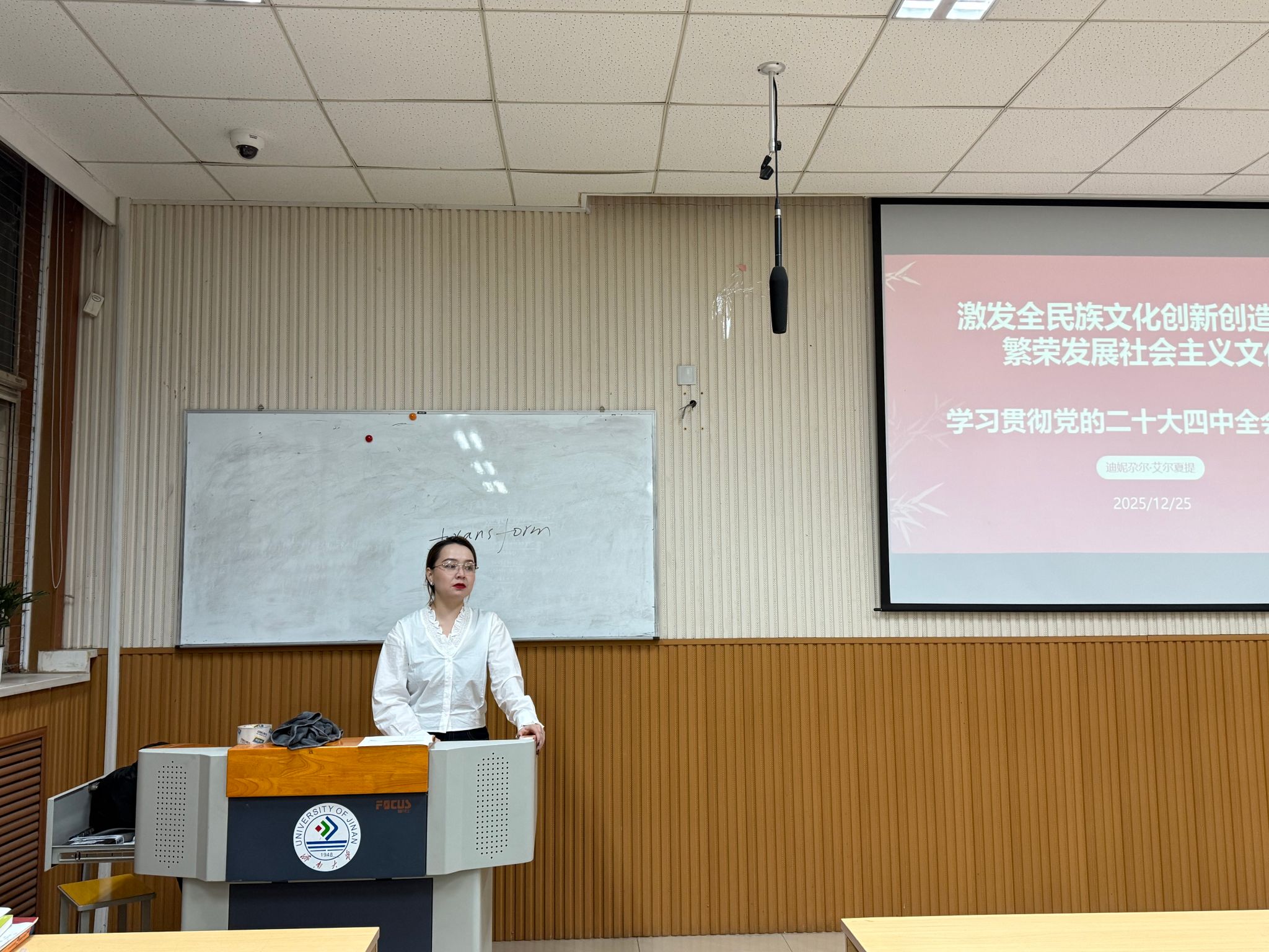 少数民族专职辅导员、学校辅导员青春对话讲师团成员迪妮尕尔・艾尔夏提,以《激发全民族文化创新创造活力,繁荣发展社会主义文化》为题,从扎根校园民族团结教育的经历出发,分享了对全会提出的“激发全民族文化创新创造活力” 的深刻体悟。她谈到,文化是民族的精神命脉,校园内各民族文化的交流互鉴、交融共生,正是社会主义文化繁荣发展的不竭动力。围绕 “铸牢中华民族共同体意识,推进中华民族共同体建设” 这一核心主题,她结合自身学习工作历程谈认识、讲感悟,寄语现场各族学子要主动加强交往交流、深化团结互助,在相知相亲中凝聚同心力量,为民族团结进步事业贡献青春智慧。