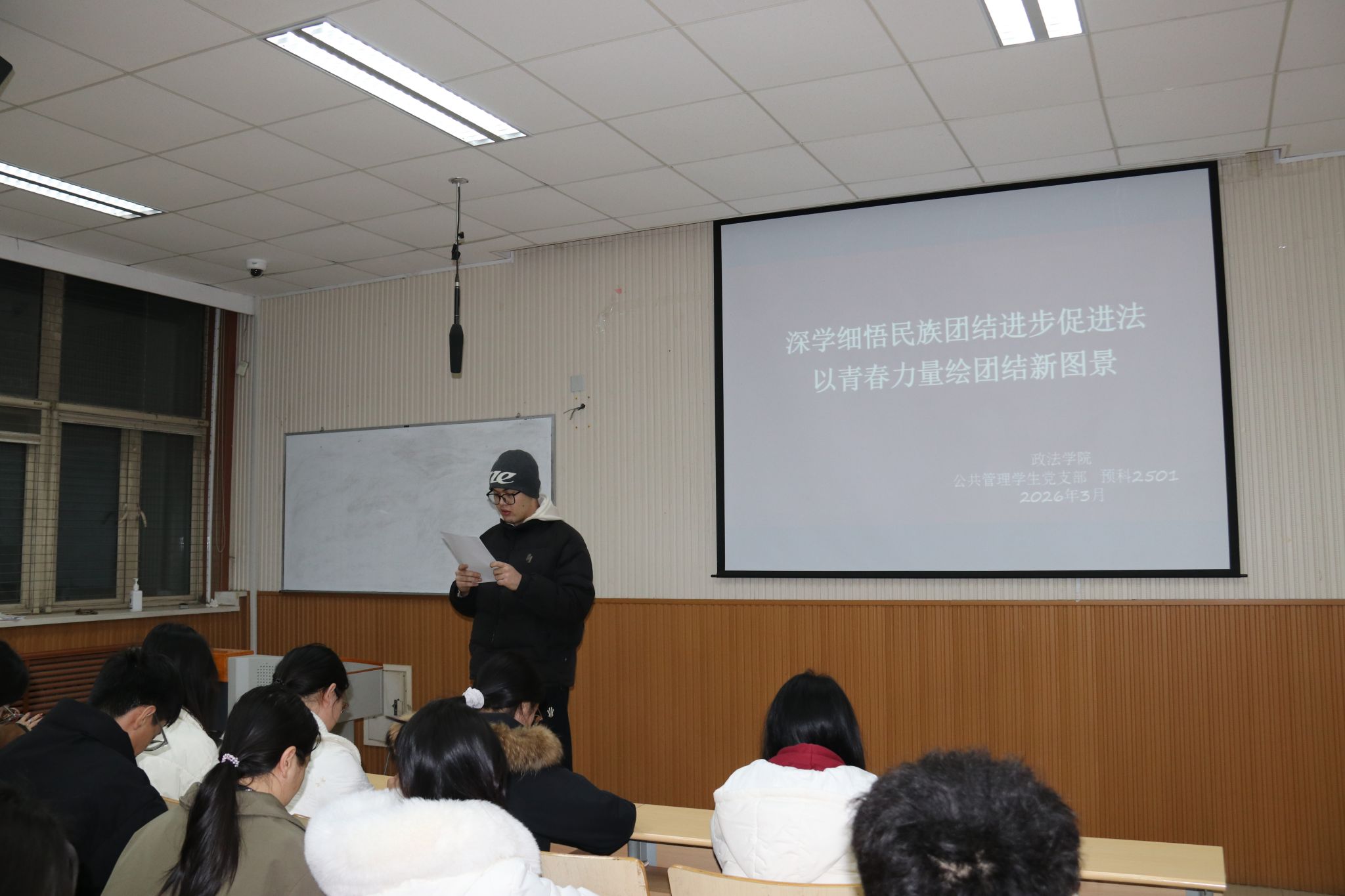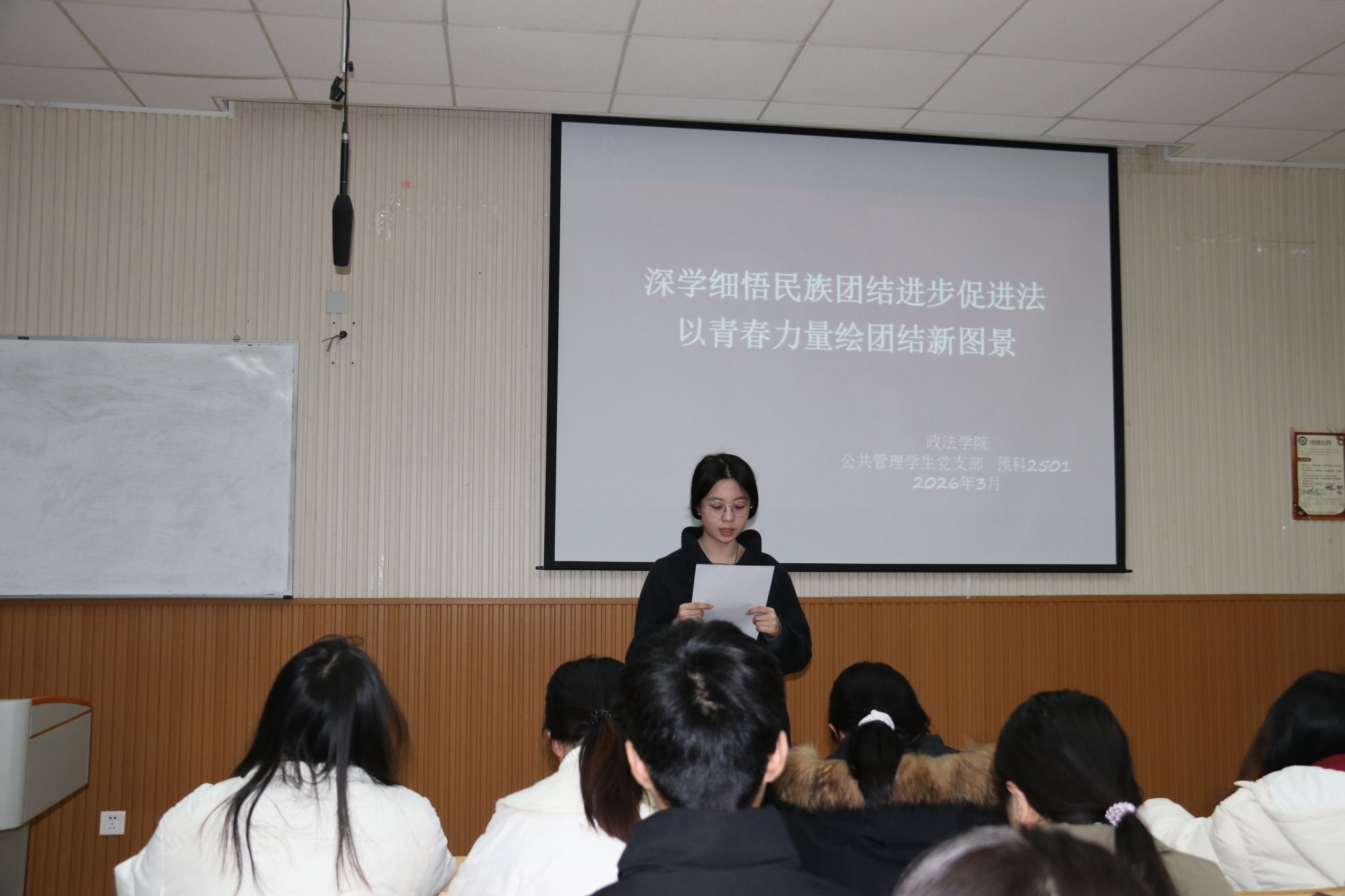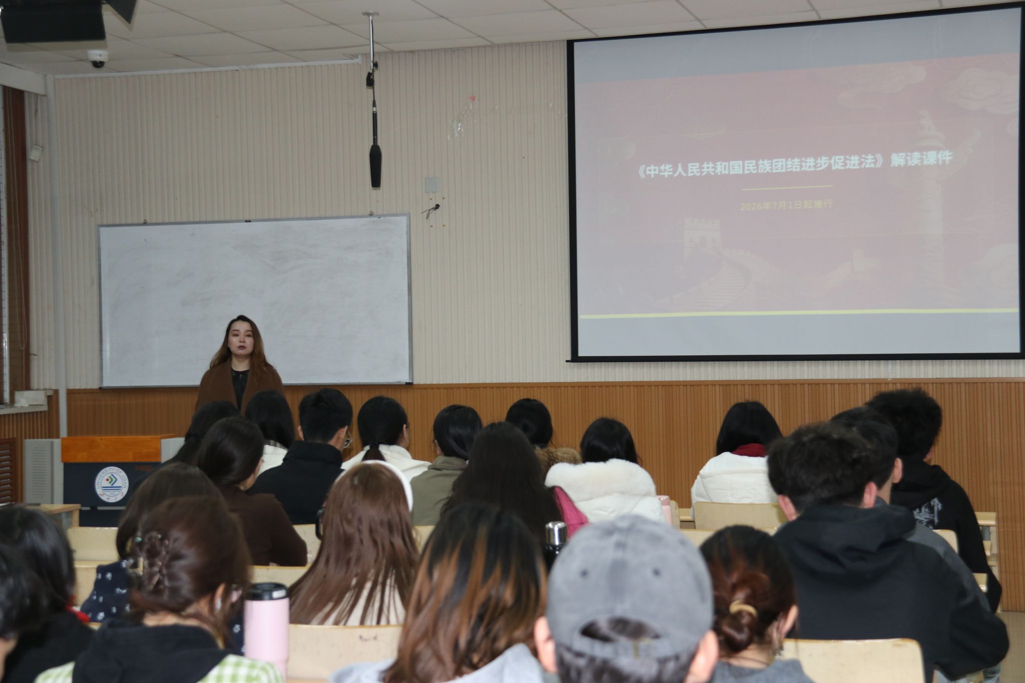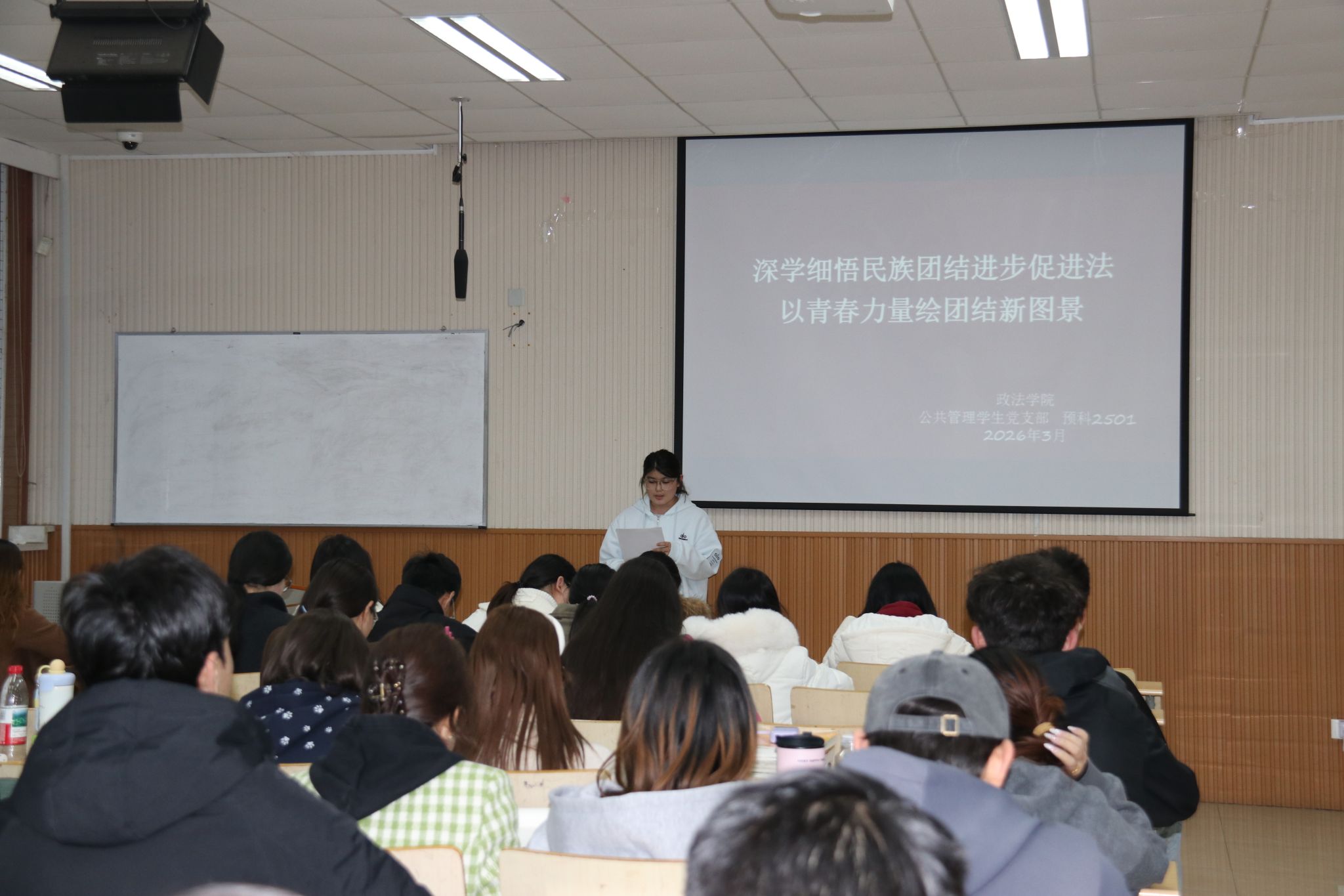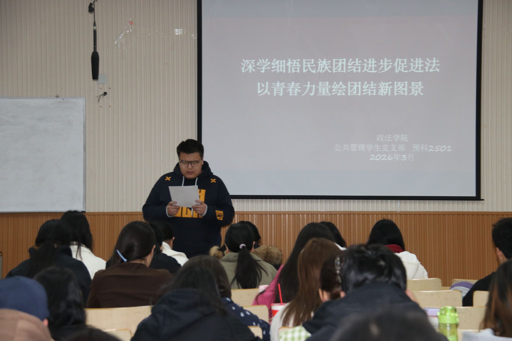 老师带领同学们研读了《中华人民共和国民族团结进步促进法》全文重点章节,围绕立法背景、核心要义与时代意义展开深入解读;深刻阐述了民族团结进步法治建设的时代价值,这部法律的出台不仅为新时代民族团结进步事业提供了坚实的法治保障,更为校园里的各族同学交往交流交融指明了方向;在校大学生是民族团结的生力军,要将法律条文内化于心、外化于行,在日常学习生活中做到彼此尊重、相互包容,用青春活力构筑中华民族共有精神家园。讨论环节,学生代表纷纷发表了学习心得,大家进一步明确了将铸牢中华民族共同体意识贯穿教育全过程的重要性。