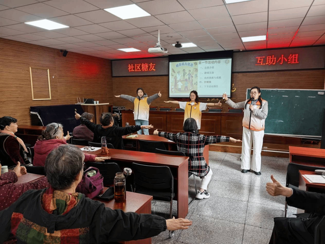 活动伊始,27位组员在社工的带领下以“抓蜜蜂”游戏开场,此环节不仅锻炼了他们的身体,还拉近了组员们的距离。随后,主讲社工分享自身控糖心得,她通俗易懂的讲解让在场的组员们感同身受。活动的核心环节是社工带领组员做降糖养生操,在教学过程中,实习生耐心纠正组员动作,组员之间互相鼓励、认真练习,整个教室充满了互助友爱的氛围。