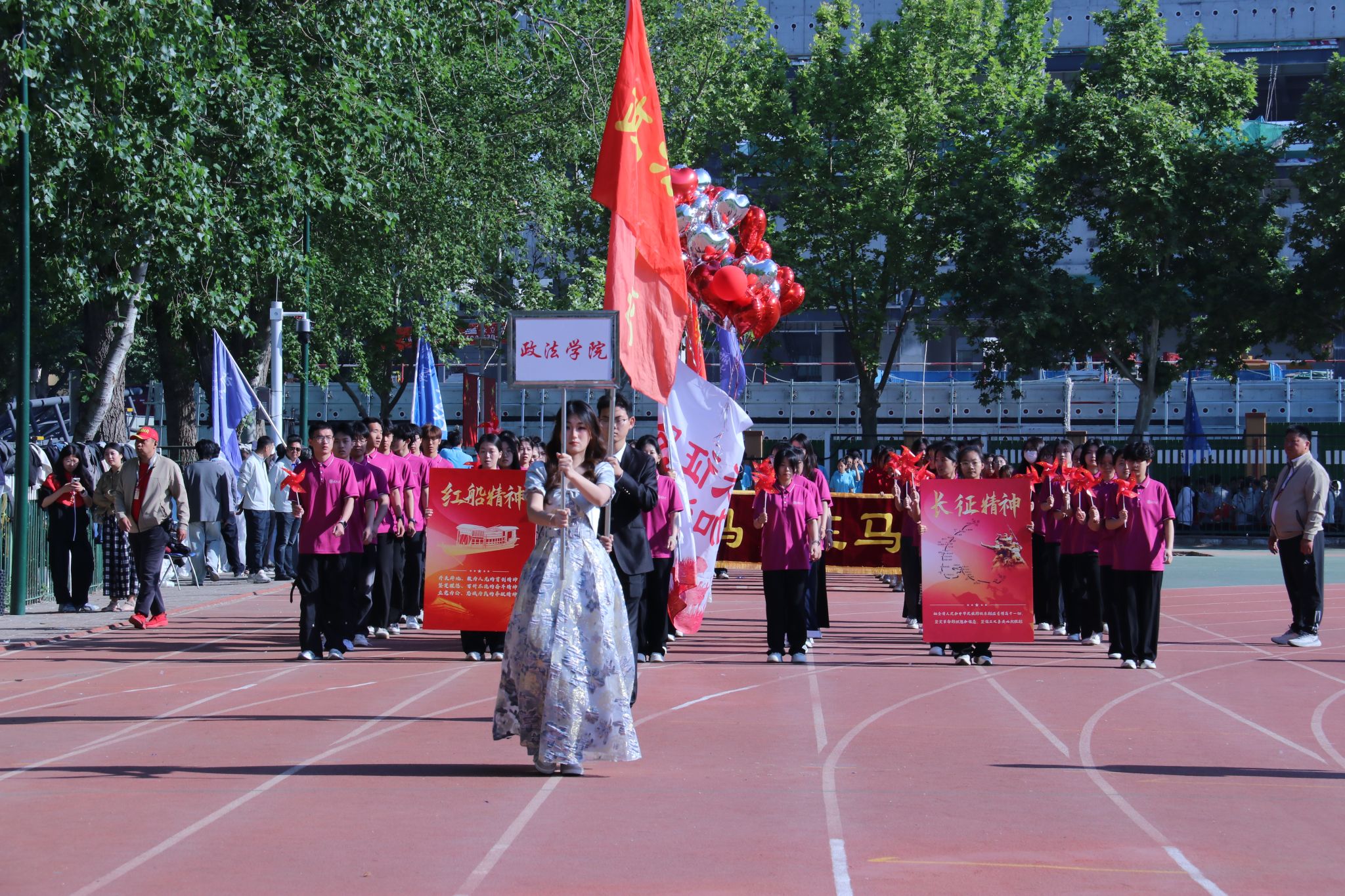 师生方队着装整齐、精神抖擞,迈着铿锵稳健的步伐昂首前行,身姿挺拔气度不凡。队伍前方醒目高举 “走好青春长征路,跑出青春加速度”主题旗帜,旗帜迎风舒展、熠熠生辉,彰显着政法青年矢志奋进、逐梦前行的理想信念。观众席上,糖心视频