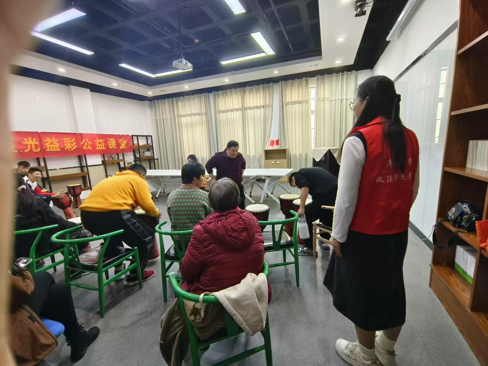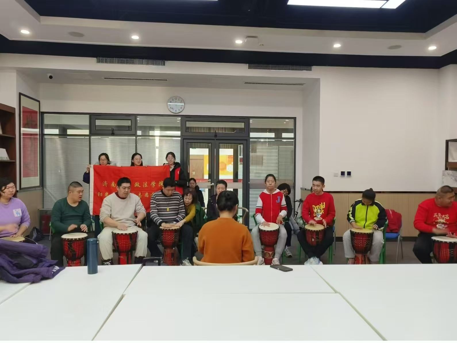 阳光先锋青年志愿者协会(以下简称“政法青协”)于济南市慧爱残疾人服务中心的星光艺彩公益课堂成功举办了一场非洲鼓公益教学活动,旨在提升残疾人朋友的语言表达能力、情绪管理与社交技巧,并丰富其精神文化生活。