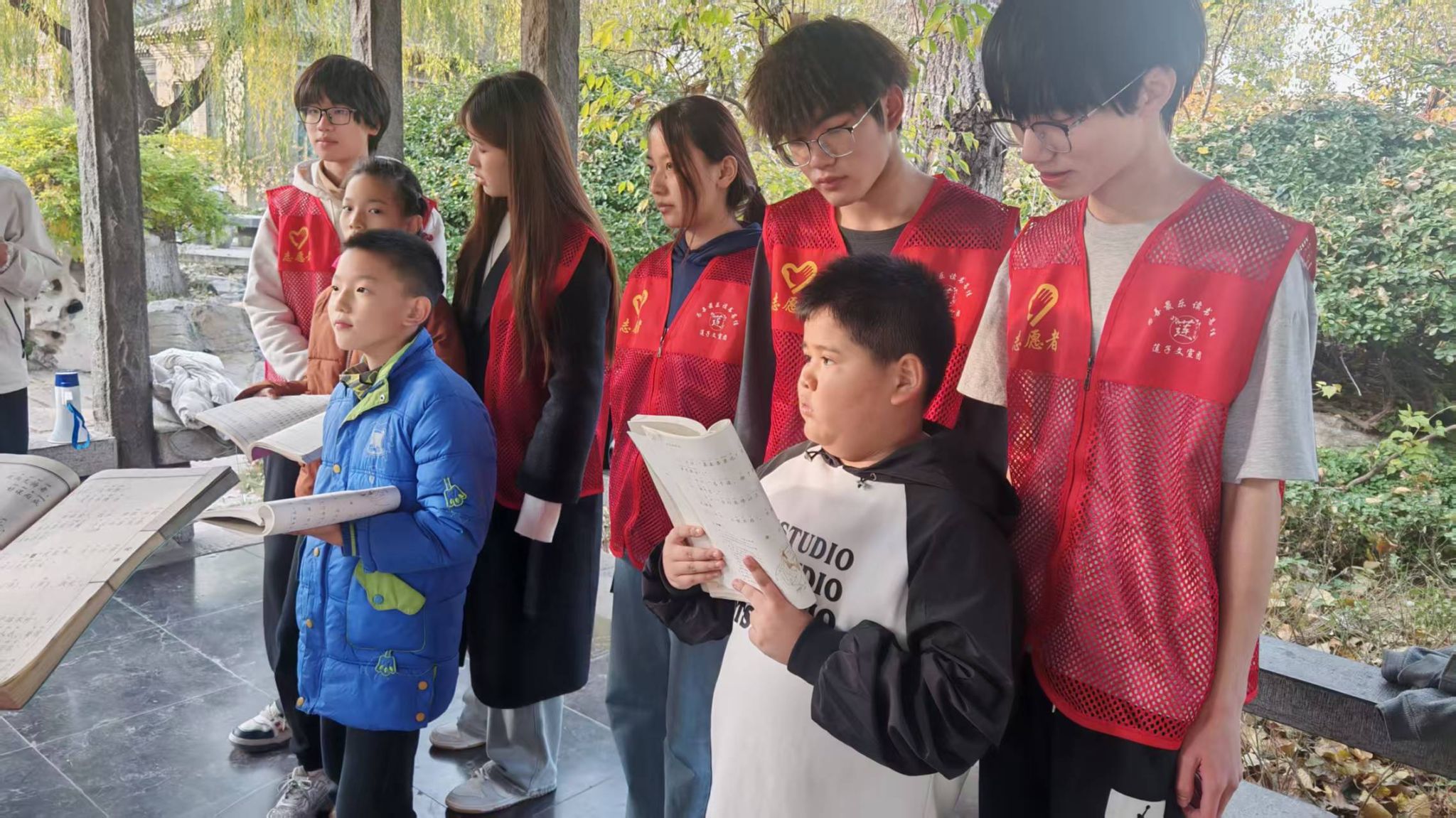 在文宣团老师的指导下,志愿者们首先整理衣冠、正身肃立,认真学习传统揖礼。从拱手姿势到鞠躬角度,志愿者们和孩子们神情庄重,一丝不苟地做着动作,互行揖礼,互相鞠躬,在亲身实践中感受礼仪文化的深厚底蕴。随后进行的《论语·述而篇》诵读环节将活动推向高潮。在老师领诵下,志愿者们和孩子们手捧书卷,跟随着老师的声音,吟诵着一句句古言。抑扬顿挫的诵读声与湖风相和,仿佛完成了一场跨越千年的对话。传统礼仪在体验中"活"了起来,经典文字在诵读中"暖"了起来,在揖礼之形与朗诵之声的双重熏陶之下,志愿者们对中华优秀传统文化的认识更加沁入身心。