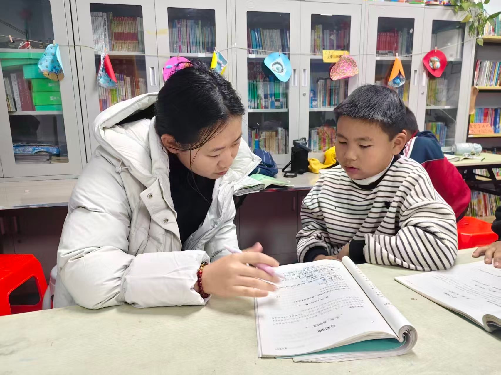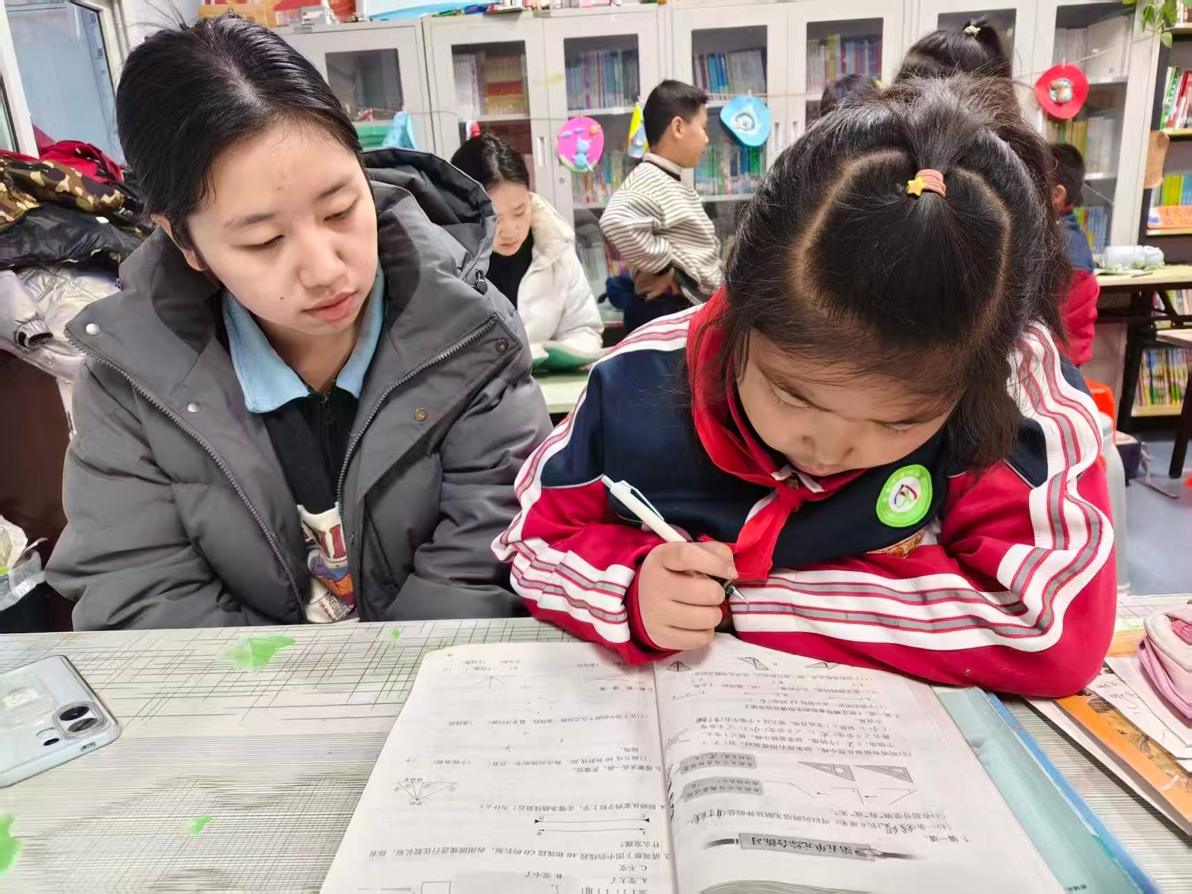 活动前期,志愿者们提前与社区工作人员对接,详细了解参与儿童的年级分布、学业薄弱环节及兴趣特点,针对性备齐辅导资料和趣味教具,为精准服务做好准备。活动现场,志愿者们分组对接孩子,耐心开展“一对一”“一对多”学业帮扶。针对古诗词理解晦涩、记忆困难的问题,志愿者创新采用“插画辅助故事讲解”形式,结合古诗背景故事绘制简易插画,播放经典诗词动画短片,将抽象文字转化为鲜活场景,引导孩子们沉浸式品味诗词意境、体悟文字情感;数学辅导环节则聚焦“生活化实操教学”,通过模拟购物算价、实物分份计数等贴近儿童生活的场景,将抽象公式、逻辑运算融入实操体验,让孩子们在动手实践中理解知识,有效提升学习效率与知识吸收度。