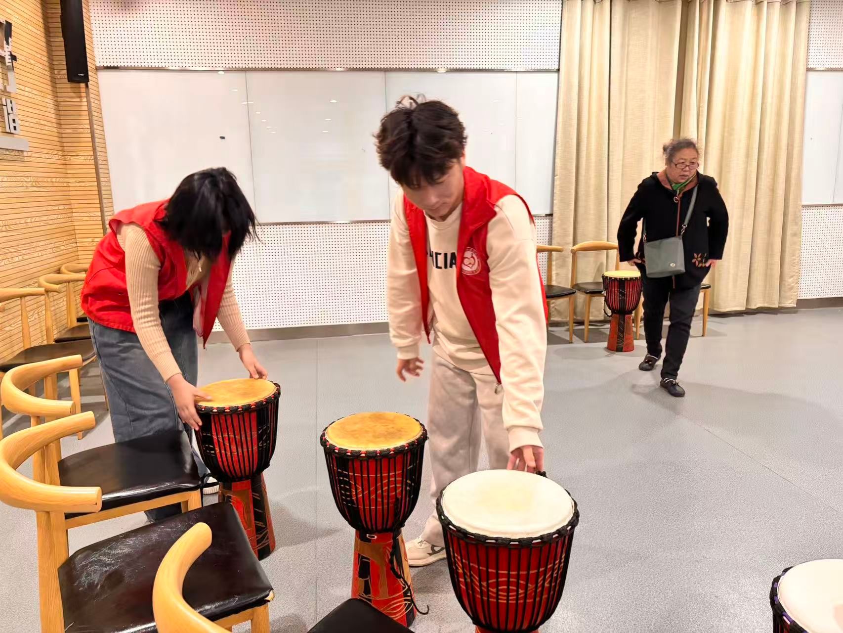 活动伊始,志愿者们提前抵达场地,将非洲鼓按半圆形整齐摆放。参与者到场后,志愿者们主动上前引导签到、协助入座。活动中,音乐老师以简洁易懂的方式拆解节奏技巧,志愿者们全程在旁陪同,带领大家从基础的“咚哒”声开始逐步练习。随着练习的推进,分散的鼓点渐渐汇聚成整齐的合奏,不少参与者在志愿者的带动下跟随节奏晃动身体,还主动与身旁同伴击掌互动;起初有部分沉默的参与者,在志愿者的耐心鼓励下,也慢慢融入了欢快的节奏之中。活动结束后,志愿者们有序推进收尾工作。整场活动下,志愿者们提供的周到服务,让温暖贯穿志愿活动始终。
