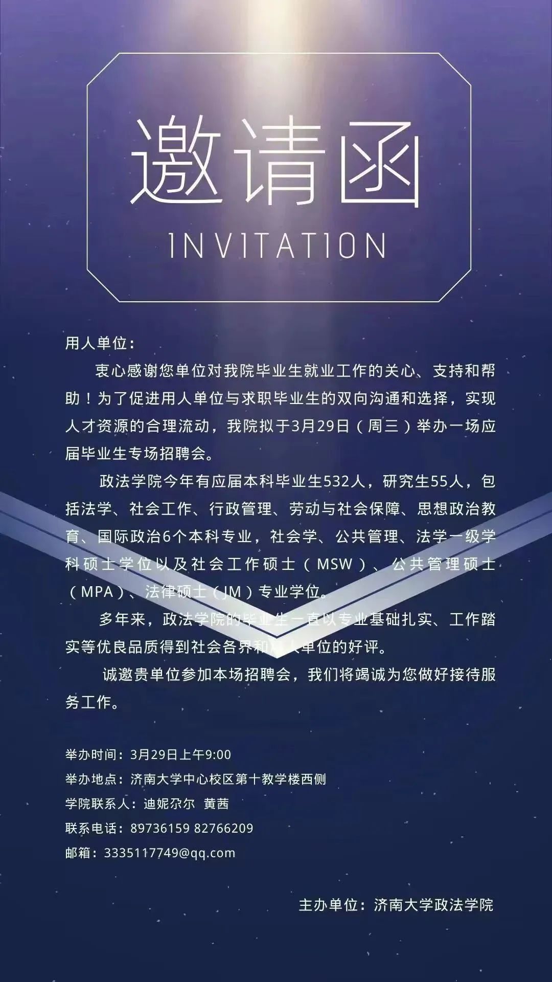 2、请参会的同学们注意着装得体、仪表规范,准备足够的求职简历,选择合适的用人单位和岗位,与用人单位有效沟通、积极主动。